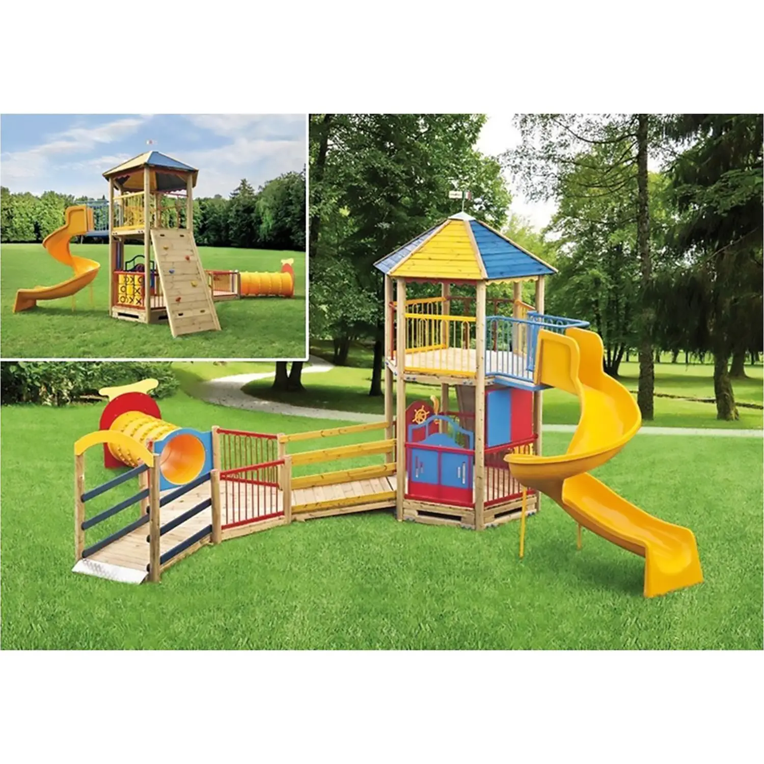 Varietà di Attività Ludiche: Equipaggiato con pannelli gioco interattivi che includono “tris”, “auto con volante e trombetta” e “nave con timone e periscopio”, offre stimoli continui e divertenti per i piccoli esploratori. Aggiunge anche un scivolo elicoidale in vetroresina per momenti di pura gioia e un tunnel in polietilene per avventure crawl-through.