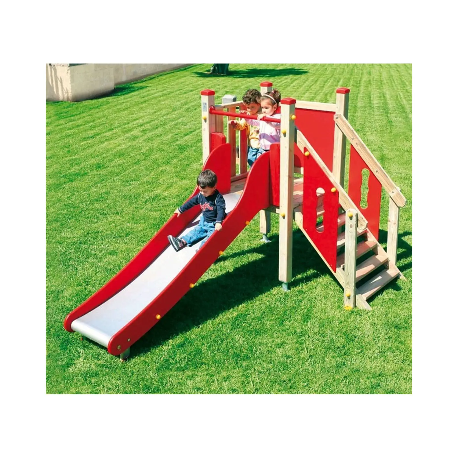 Pista scivolo in acciaio inox da cm 210 con torretta provvista di ringhiera perimetrale in legno con pannello sagomato in polietilene.