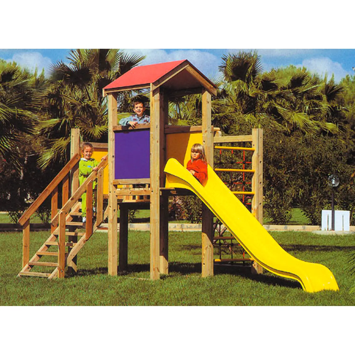 Elementi di Gioco Dinamici: Dotato di una scala accessibile con doppio corrimano per la sicurezza dei più piccoli, un scivolo in vetroresina di 3 metri con sponde rialzate per discese divertenti e sicure, una spalliera svedese per esercizi di arrampicata, e una pertica per giochi di equilibrio e forza.