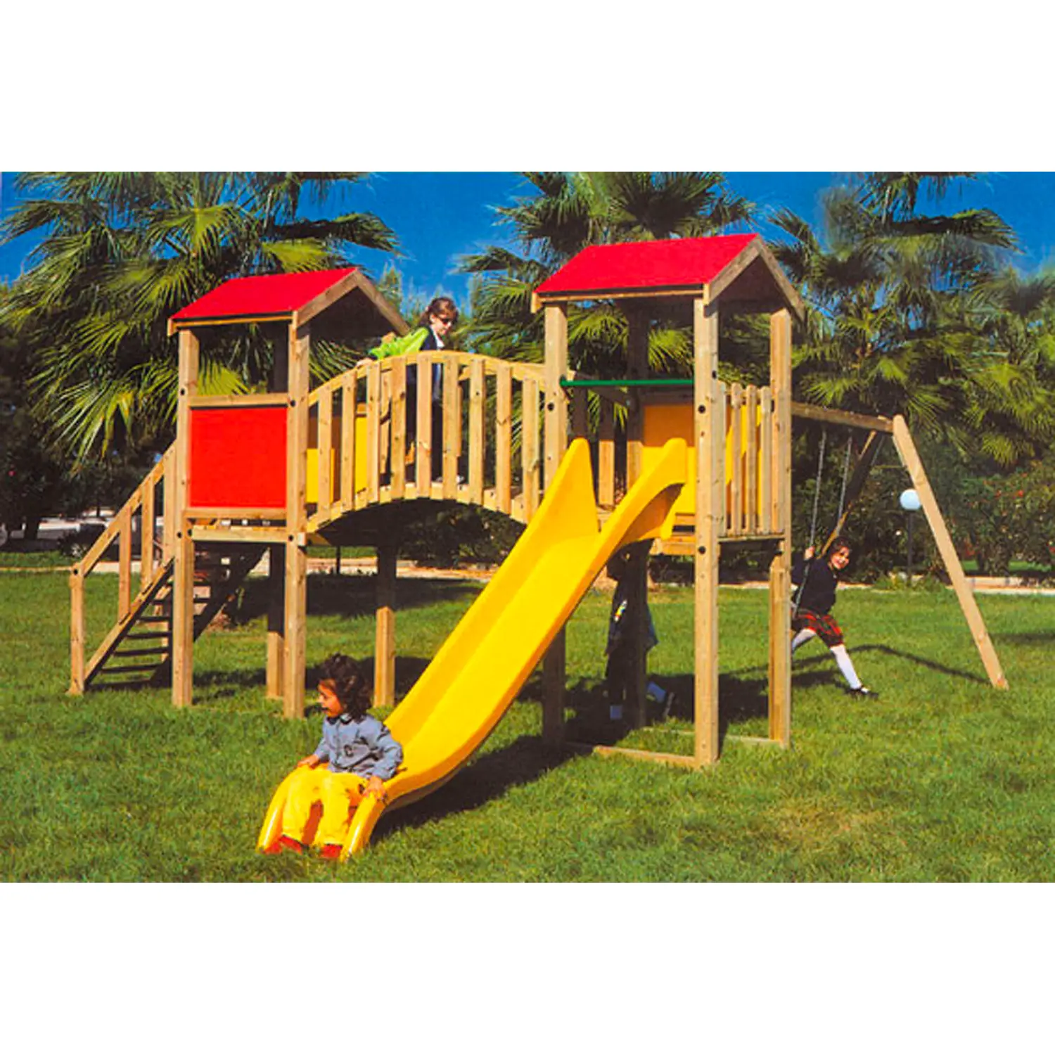 Il Fortino Sioux con Altalena è una struttura gioco completa da esterno, ideale per parchi giochi, scuole e giardini. Progettato per offrire divertimento, sicurezza e sviluppo motorio, combina torrette, ponte, scivolo e altalena in un’unica soluzione.