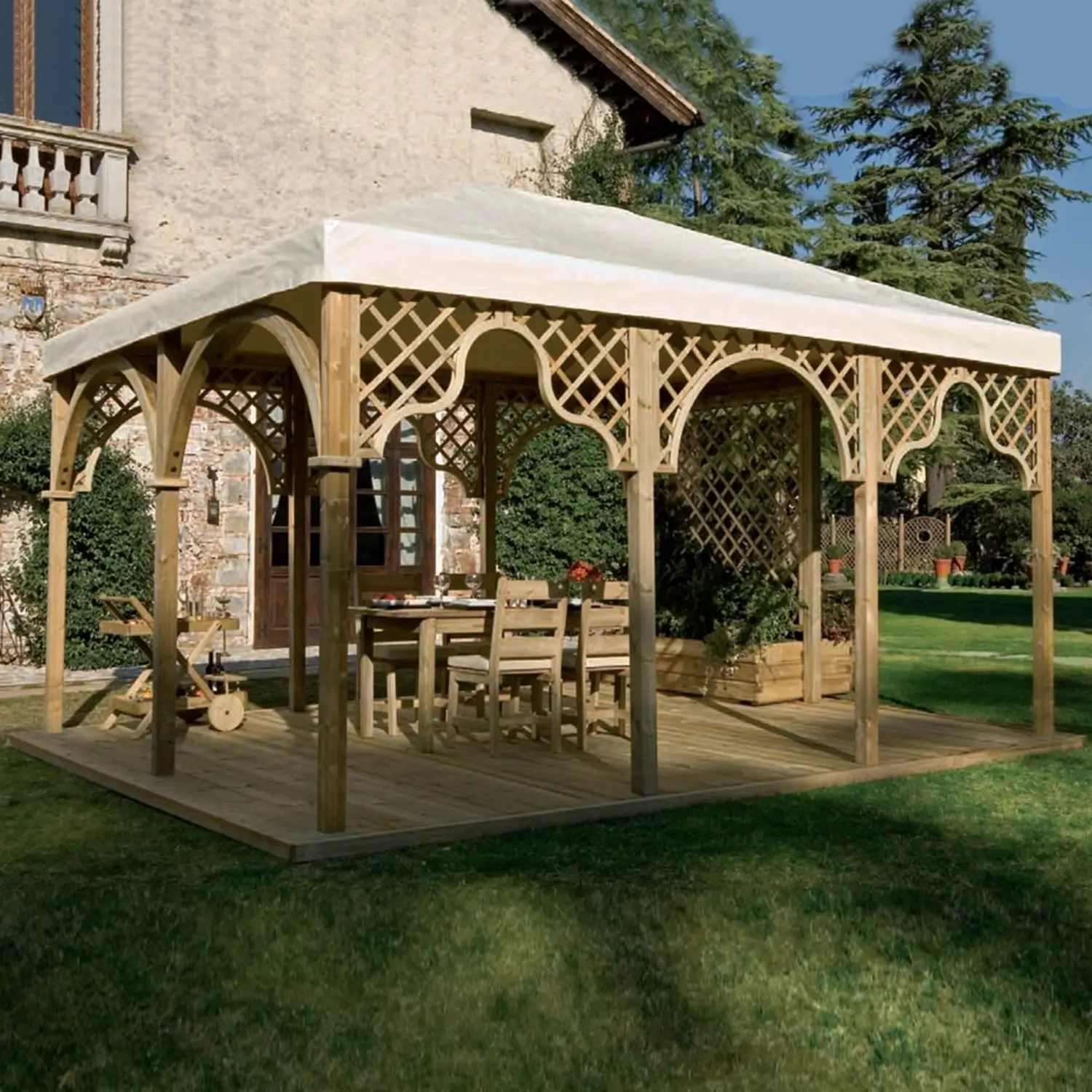 Ideale per ogni giardino o spazio verde, si può personalizzare alternando superfici libere a superfici tamponate con grigliati e fioriere. La struttura è in bilama di Pino nordico sezione 9x9 cm trattato in autoclave, con fasce perimetrali e puntoni 4,5x14 cm.