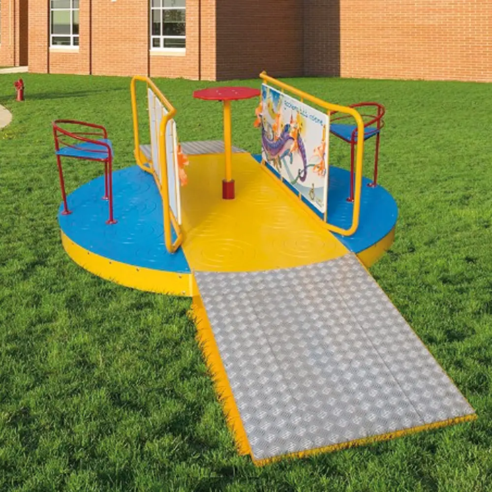 - Piano di calpestio in polietilene atossico fresato antiscivolo; - Manubrio centrale di trazione in polietilene; - N.2 sponde di sicurezza in tubo tondo zincato e pannelli in multistrato; - N.2 sedili per accompagnatori; - N.2 postazioni per carrozzelle disabili con cinghie di sicurezza; - N.2 rampe di accesso per carrozzelle, con fermo di sicurezza per facilitare l’accesso ai bambini diversamente abili