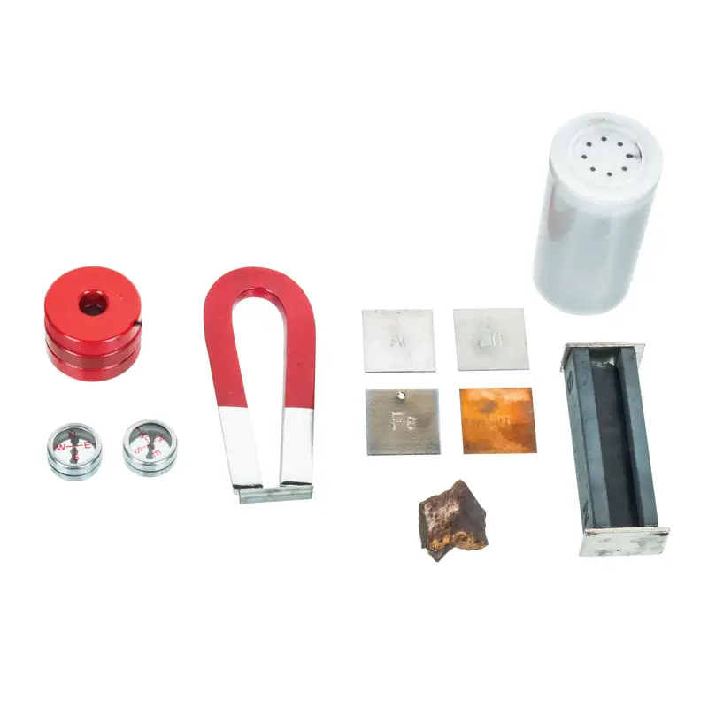 - calamita a ferro di cavallo cm 10 - 2 barre di ceramica mm 75 - 3 anelli di ceramica ø 38 mm - 2 bussole ø 19 mm - Campioni di magnetite, ferro, alluminio, zinco, rame