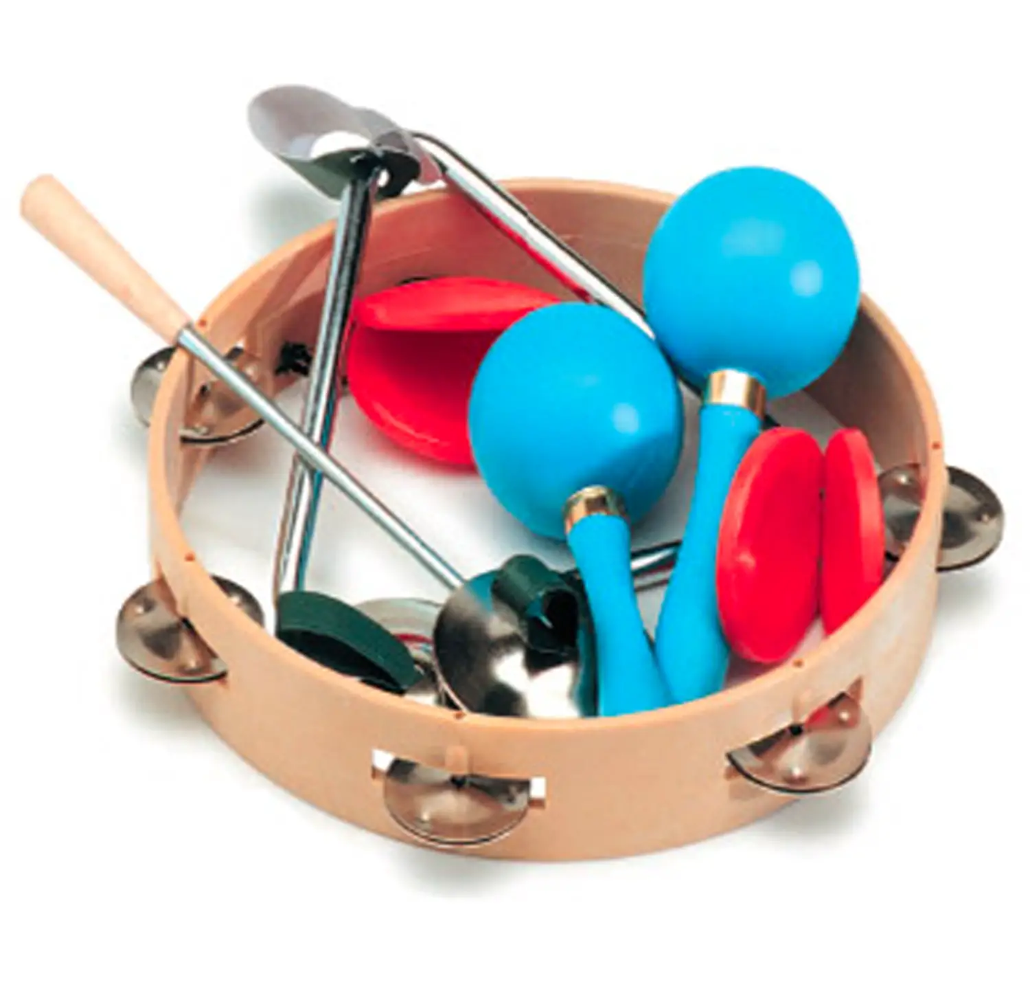 - ✅ Set musicale completo con nacchere, maracas, piattelli, triangolo e cembalo in formato mini per bambini.