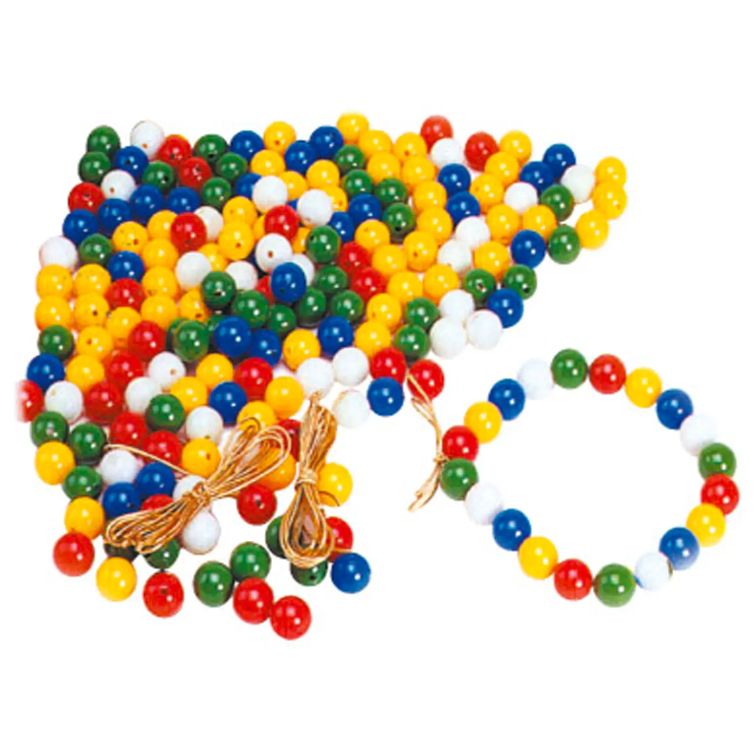 Plastic stringing beads, assorted in 5 colors with accompanying laces.