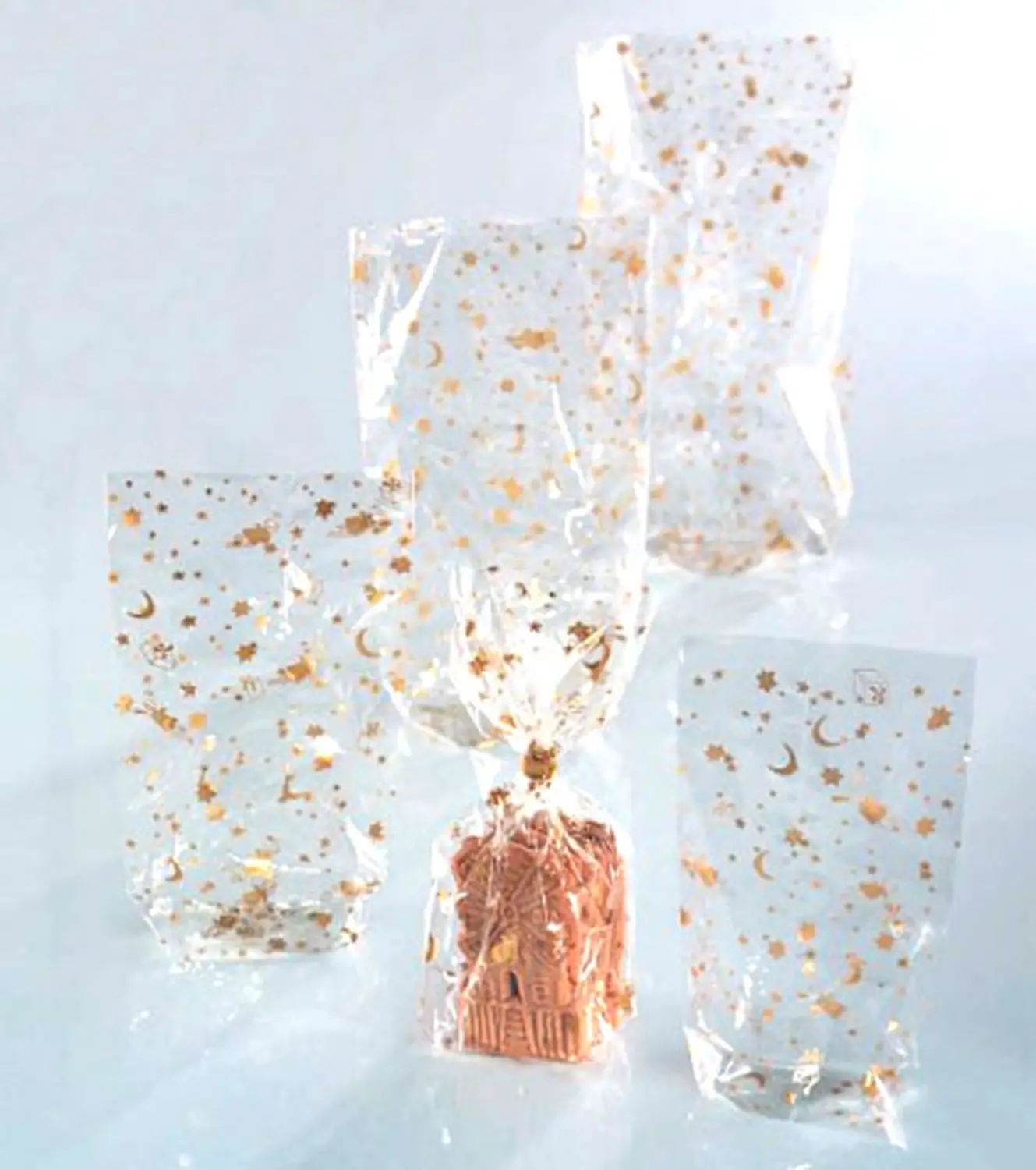 - Buste trasparenti con decoro oro: Stelline e lune dorate per un effetto elegante e raffinato.