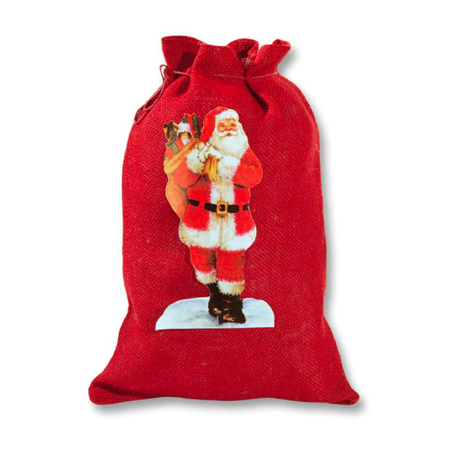Soft natural jute bag with drawstring closure and Santa Claus decoration.