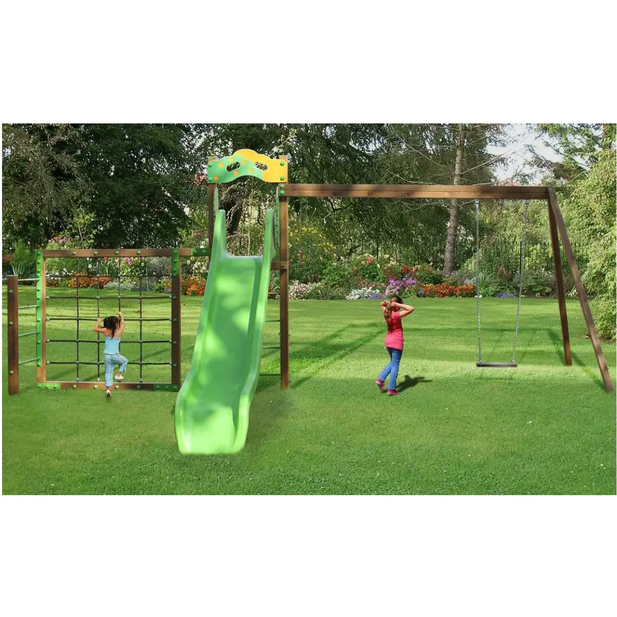 salita in corda poliammidica diam. 16 mm, con anima a 6 trefoli di acciaio e da un’arrampicata verticale (spalliera) in acciaio zincato e verniciato. Completa questa grande attrezzatura ludica l’altalena costruita con montanti bilama di sez. cm 7x7 e una trave superiore composta da doppio palo bilama di sezione cm 7x7. Scala a pioli realizzata in acciaio zincato e verniciato. Pannello d’ingresso scivolo in polietilene con personalizzazione da un lato. Scivolo in polietilene rotazionale ad alta densità