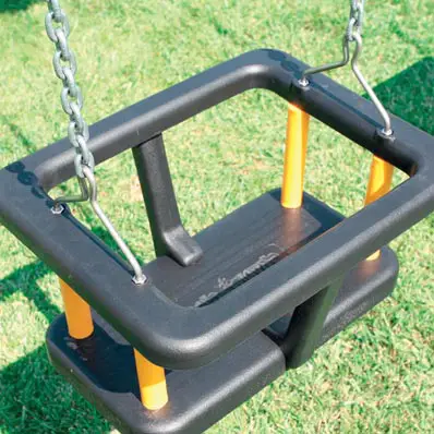 Approved cage seat, made of "shock-absorbing" anti-trauma rubber, with inner core of pre-molded steel, supported by tight-mesh galvanized chains, movement on self-lubricating Teflon bushings.