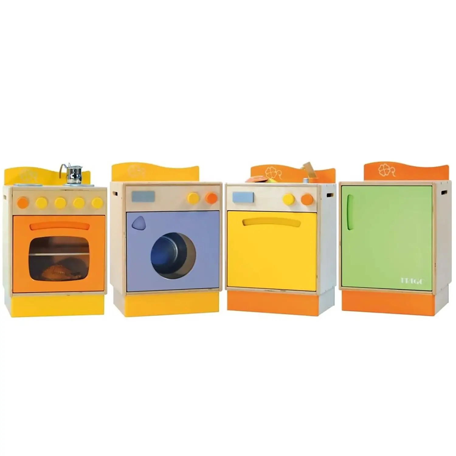 La Serie Completa Cucina Allegra è un set di mobili gioco ideali per i bambini della scuola dell’infanzia. Questo set completo è realizzato in multistrato di betulla verniciato al naturale con bordi arrotondati e parti laccate in colori pastello. Il design include feritoie sui fianchi che funzionano come maniglie per facilitare lo spostamento. La serie completa include una cucina con forno, un lavello con lavastoviglie, una lavatrice e un frigorifero con anta apribile e cestello interno.