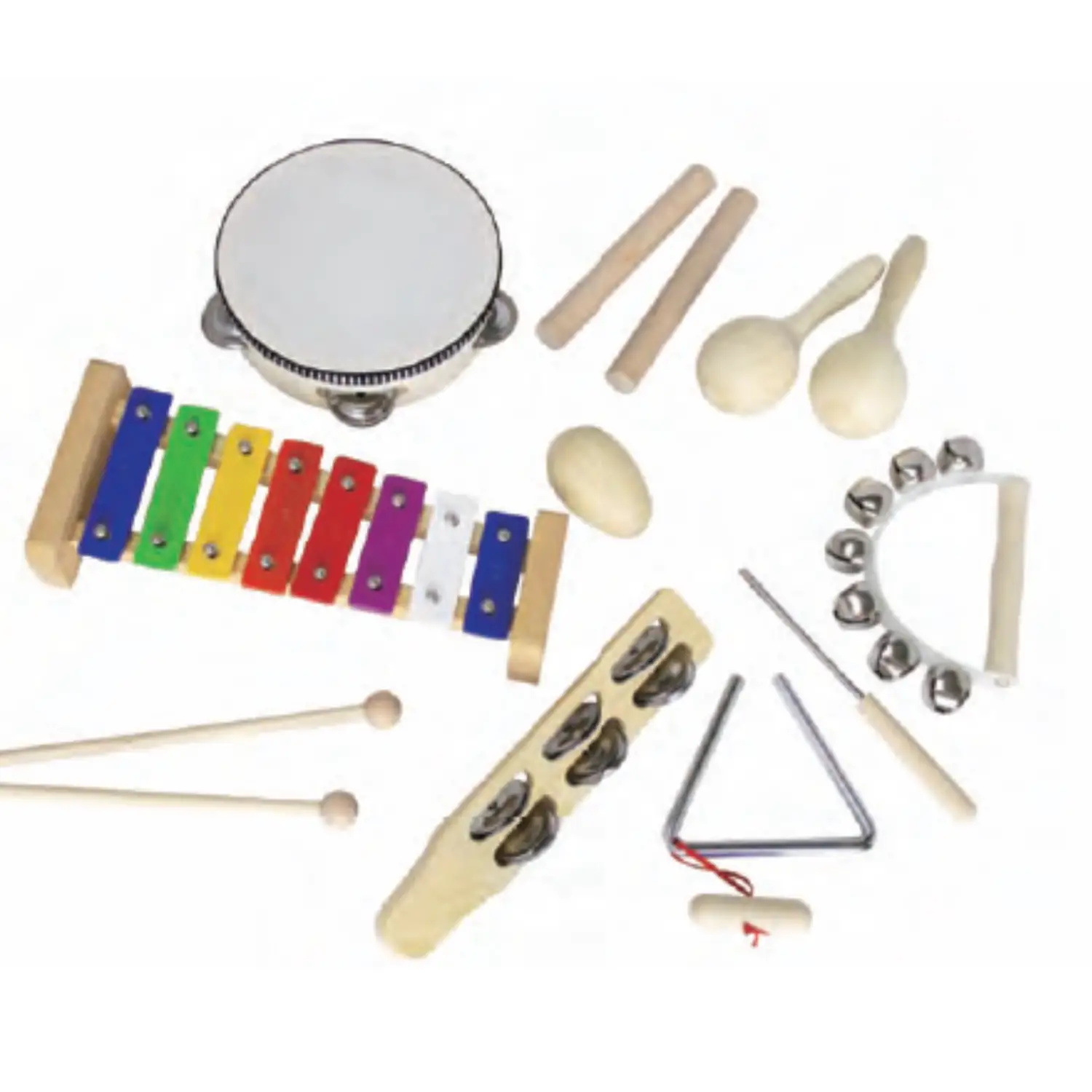 - Set Completo da 10 Strumenti Musicali: Include maracas, metallofono, triangolo, tamburello, legnetti sonori e altri strumenti per una varietà di suoni e timbri.
