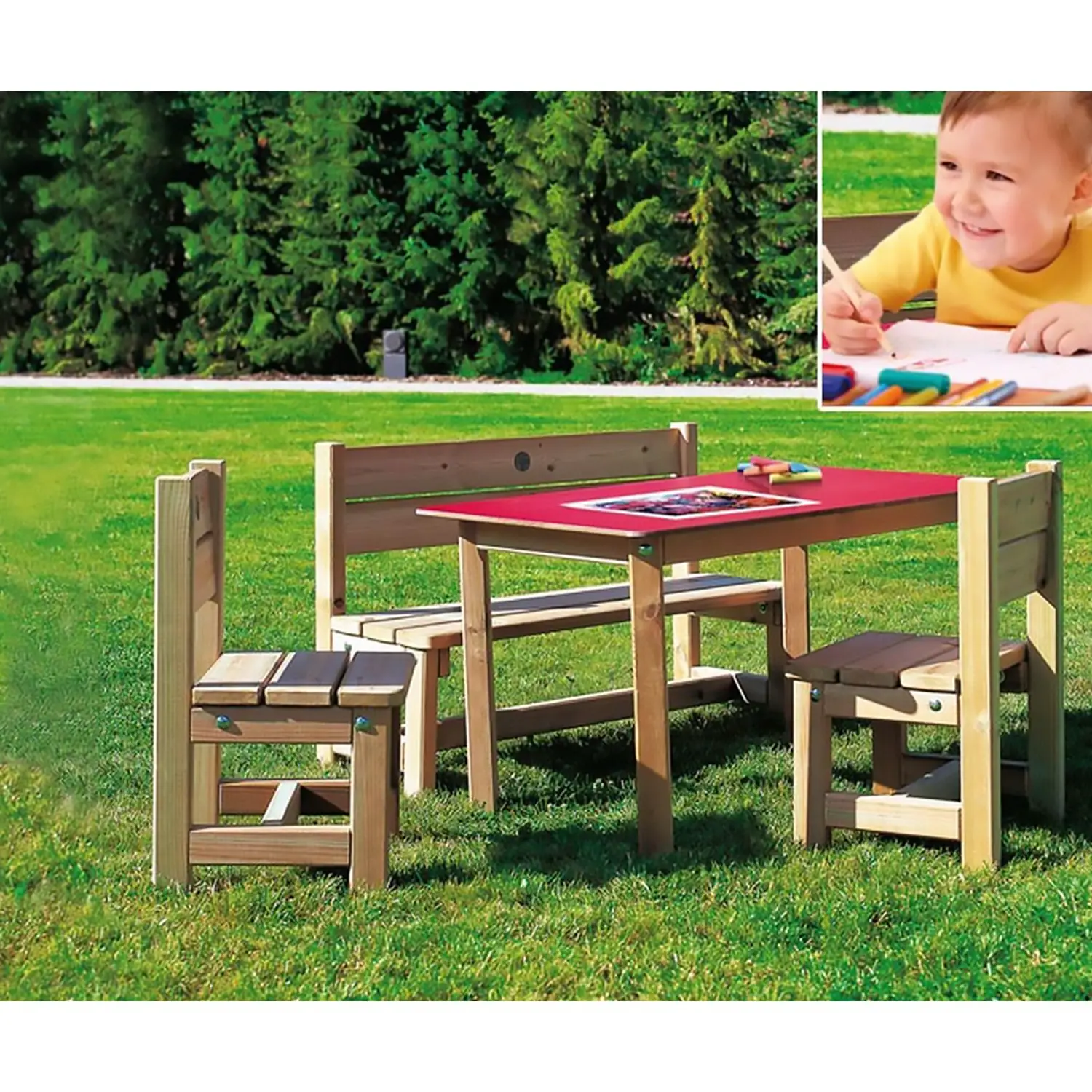 Set composto da una panchetta dim. cm. 35x90x60h, due sedioline dim. 35x35x30/60h e un tavolo centrale dim. cm. 60x90x53h.