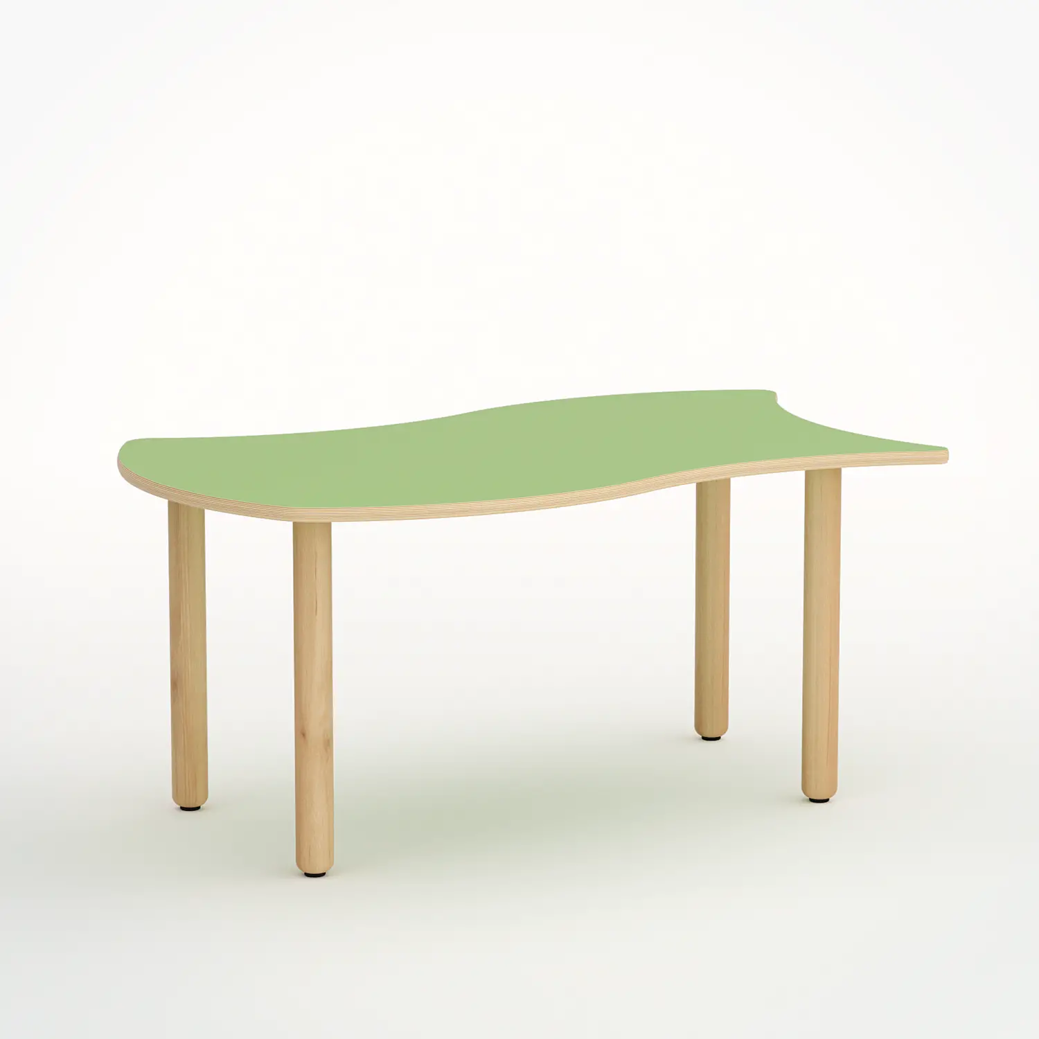 Piano in multistrato di betulla Piano da 22 mm in multistrato di betulla, placcato con bilaminato plastico colorato. Antiriflesso, antigraffio e lavabile, garantisce resistenza e praticità d’uso. - Conforme CAM Criteri Ambientali Minimi. Gambe in faggio massello Gambe in faggio massello ø 60 mm, verniciate con vernice trasparente atossica all’acqua. Dotate di gommini antisdrucciolo per stabilità e sicurezza. Design a “onda” versatile La sagoma a “onda” consente di accostare i tavoli per creare composizioni flessibili. Ottimizza gli spazi senza rinunciare alla funzionalità. Sicurezza e dimensioni Gli spigoli e bordi arrotondati evitano traumi accidentali. Misure: 70x120 cm, altezza 55 cm, ideale per scuole primarie.