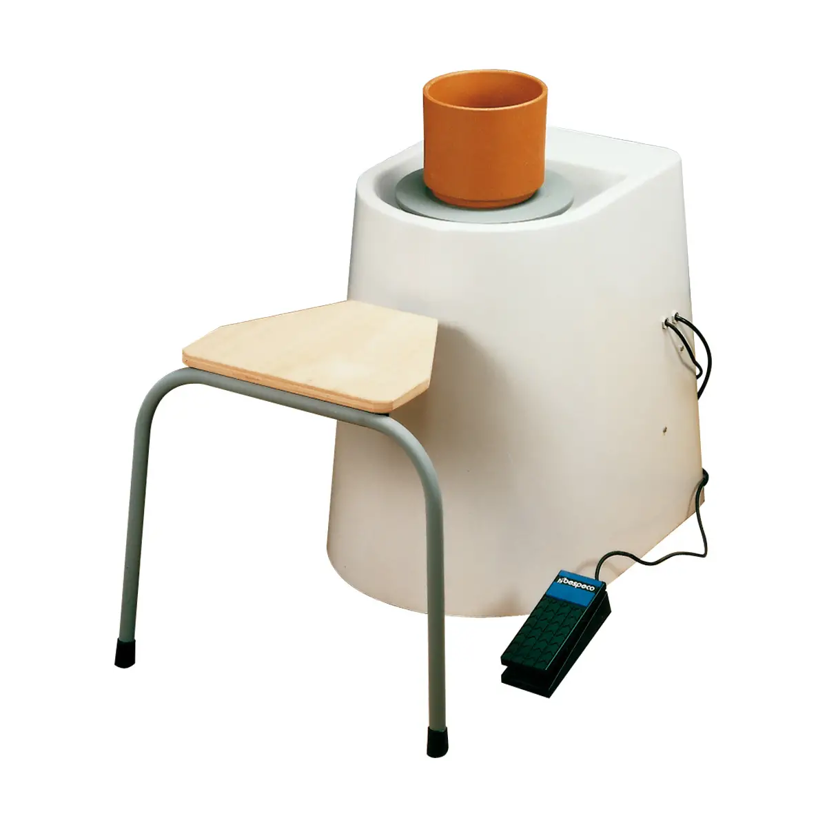 Tornio elettrico da studio per vasai con scocca in vetroresina rinforzata, sedile incorporato e variatore di velocità elettronico a pedale (da 30 a 250 giri al minuto) che permette all’operatore di avere le mani libere.