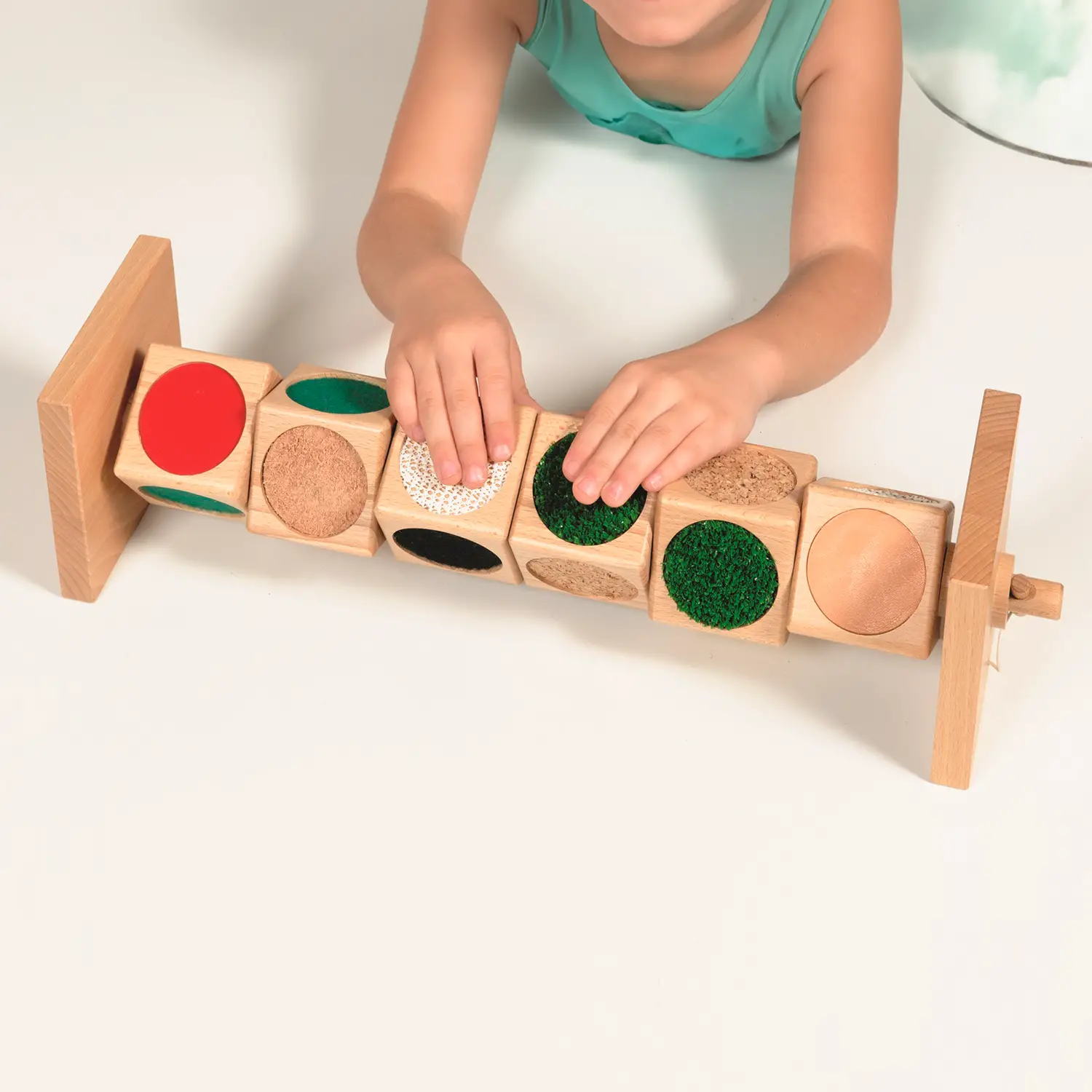 Questo gioco stimola l’esplorazione tattile attraverso la manipolazione di cubi intorno ad un asse in legno, offrendo una varietà di texture.