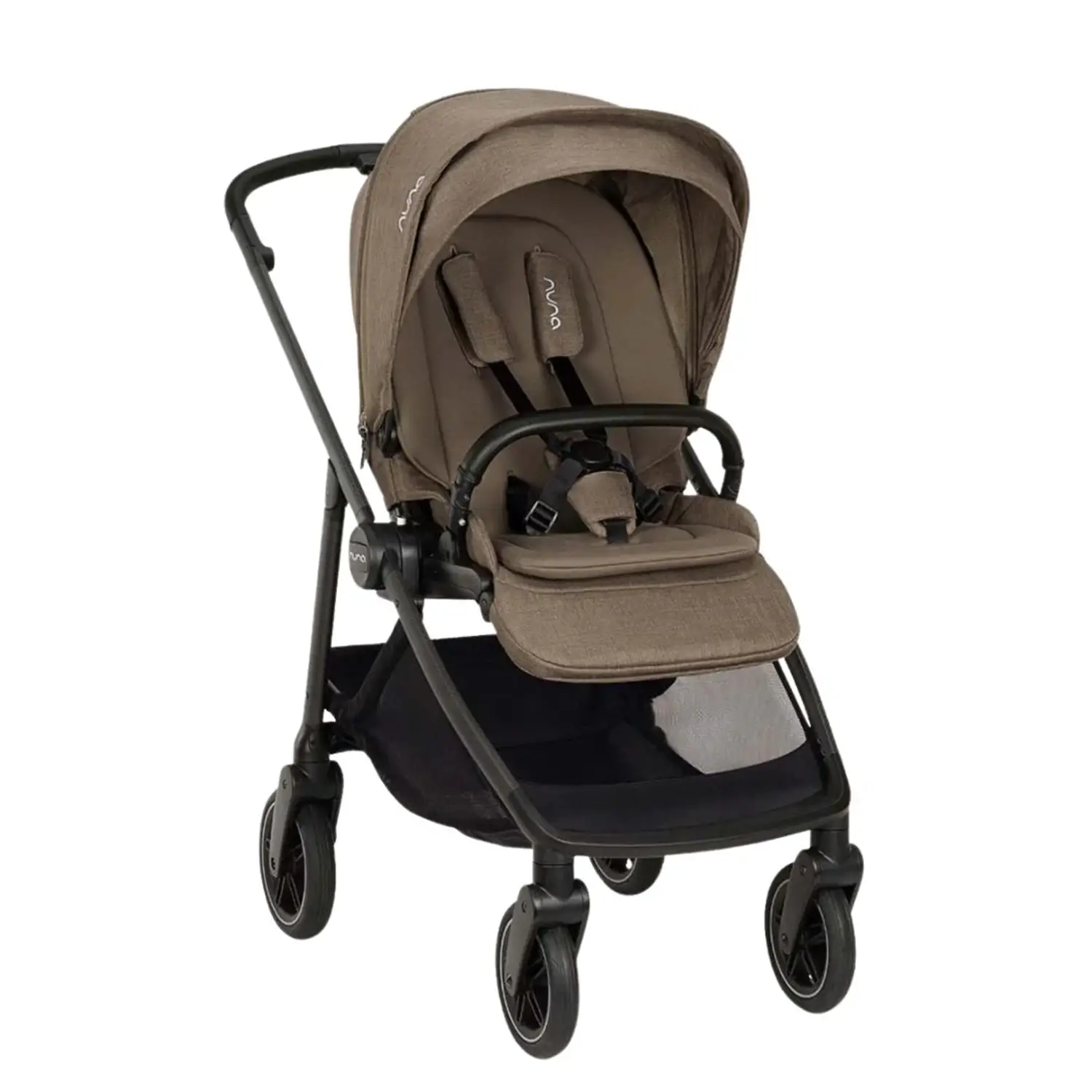 360° rotation on all wheels - Activated with a button, allows easy movement in any direction. Versatile travel system - Compatible with all Nuna car seats and LYTL and Cari Next carrycots (adapter included). Integrated suspension - Spring technology absorbs shock for maximum comfort on any terrain. Premium construction - Aluminum frame reinforced with carbon fiber for strength and light weight. Premium materials - Push and safety handle with faux leather details, merino wool insert and Lyocell Tencel for breathable and comfortable seating. Ultra-compact closure - Folds easily with one hand for effortless carrying. Adjustable Comfort - One-handed recline to 3 positions, including the sleeping surface for optimal sleep. Advanced Safety - 3- to 5-point adjustable harnesses and one-touch braking system for maximum stability. Ample storage space - 10-pound capacity basket and zippered back pocket for storing everything you need. Adjustable leg rest - Two positions to accommodate baby's growth. Wheels with EVA foam suspension and tires - Tackles any terrain with no problem. UPF 50+ water-repellent canopy - Optimal protection in all weather conditions.
