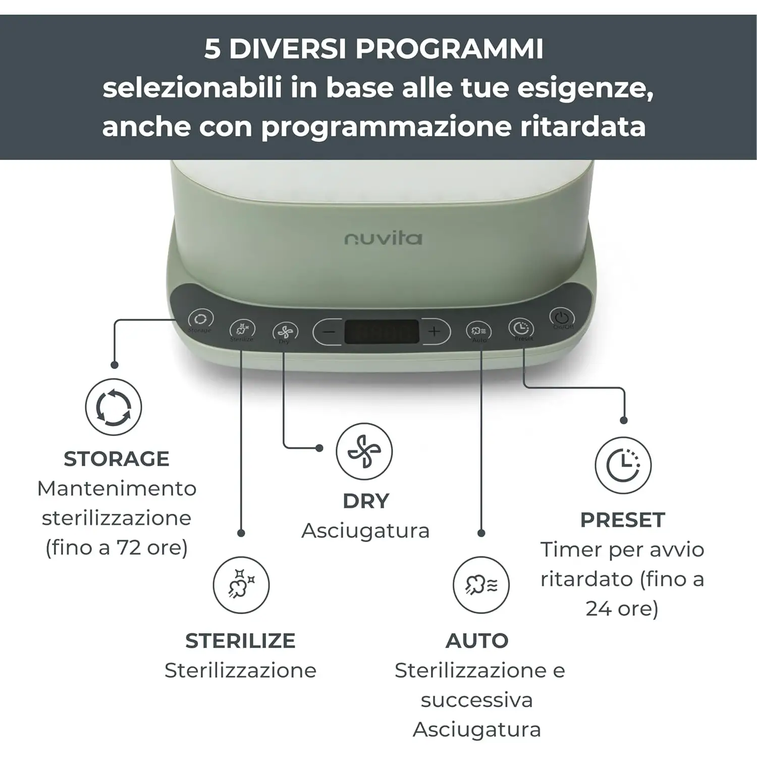 5 Programmi Automatici per Ogni Esigenza Scegli tra 5 modalità: Sterilizzazione + Asciugatura automatica, Solo Sterilizzazione, Solo Asciugatura, Conservazione Sterile 72H e Avvio Ritardato fino a 24 ore. Il sistema si spegne automaticamente a fine ciclo, garantendo sicurezza e risparmio energetico. Una gestione intelligente che si adatta ai ritmi quotidiani dei genitori moderni.