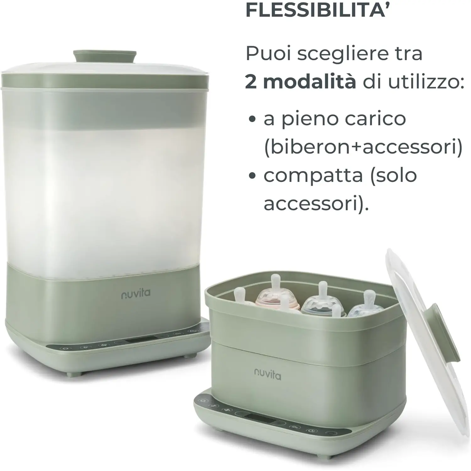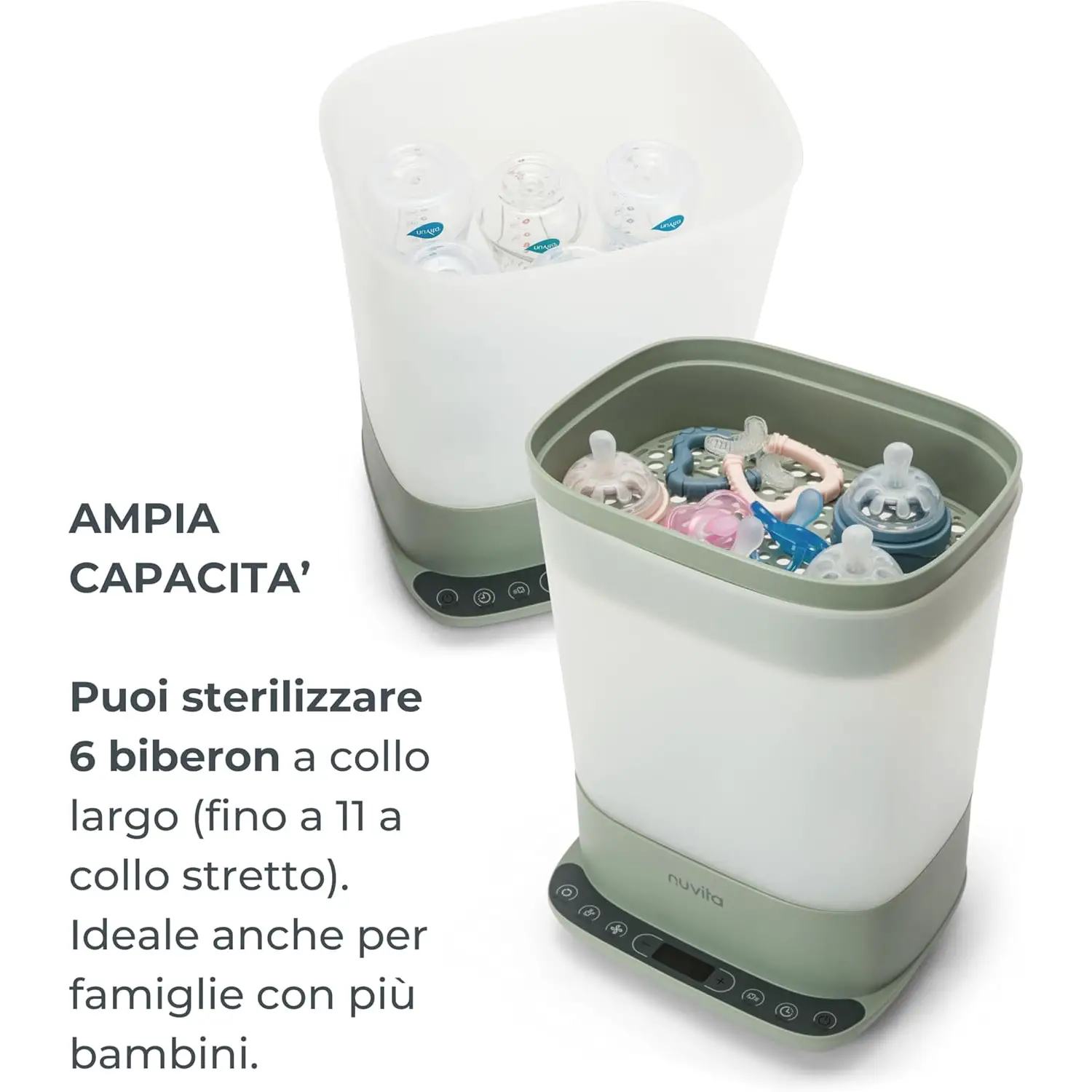 Grande Capacità per Famiglie Numerose Progettato per sterilizzare fino a 6 biberon a collo largo o 11 biberon a collo stretto contemporaneamente, oltre a numerosi accessori. La doppia modalità di utilizzo – pieno carico o compatta solo accessori – offre massima flessibilità. Perfetto per famiglie con più bambini o per chi desidera ottimizzare tempi e cicli di sterilizzazione.