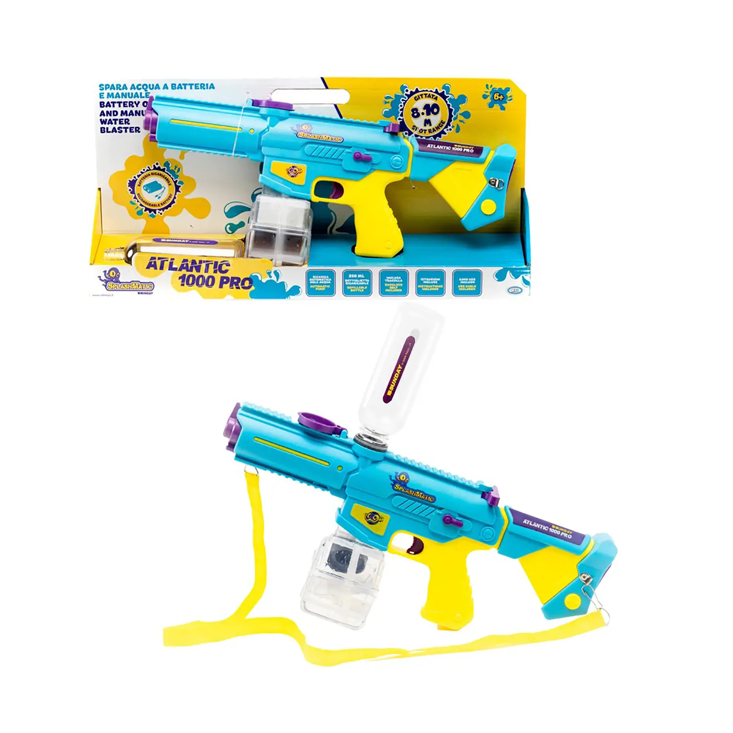 Impeccable Design and Powerful Spray With an attractive design and advanced features, the Splashmatic Atlantic 1000 Pro allows you to dominate any aquatic battle. Its electric mechanism ensures a fast and powerful spray for guaranteed fun.