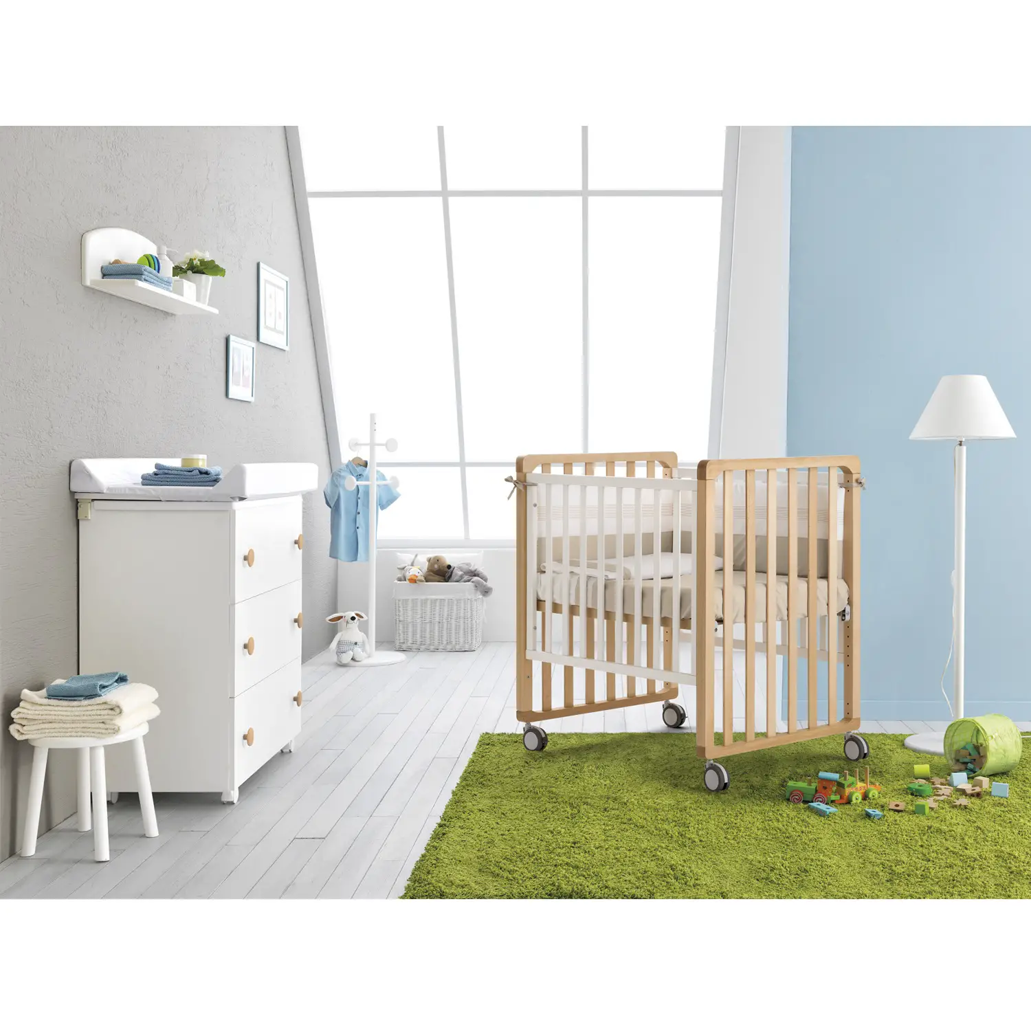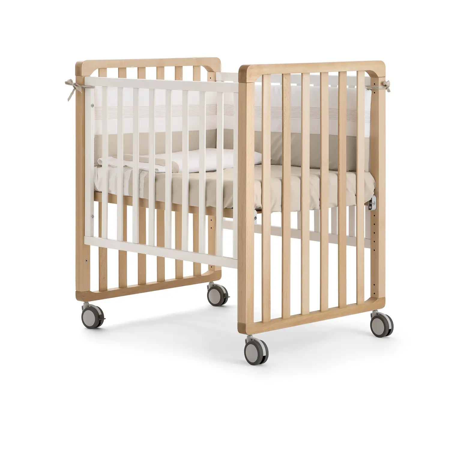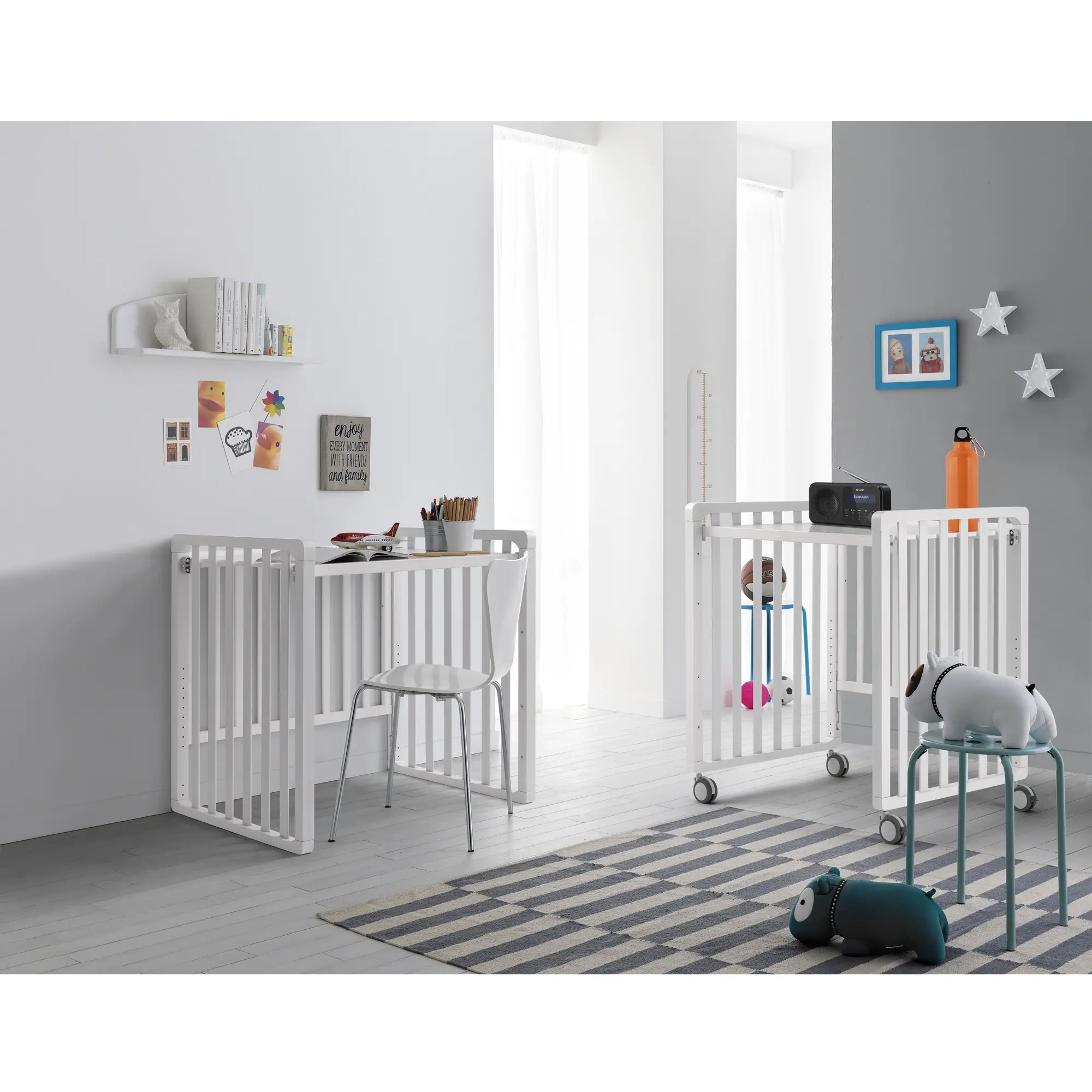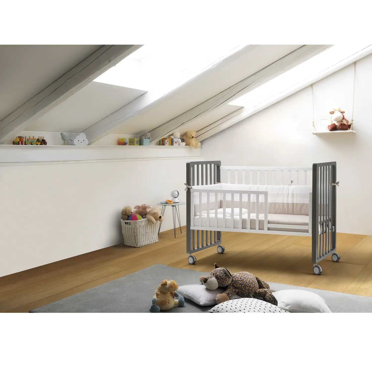 1Cradlewith movable side rail - Adjustable to multiple positions, with four maxi rubberized wheels for easy movement. 2Dodern design and thoughtful finish - Perfect for any style of nursery. 3Mountaineer crib with mini crib (sold separately) - Encourages child independence. 4Bedside crib - Adjustable thanks to the net positions and attachment straps. 5Mountaineer crib - By lowering the bed base and removing the side rail, it transforms into a safe and accessible bed for the child. 6Child 's desk - With the addition of the top (sold separately), the crib transforms into a useful study station. 7Multipurpose Cart - Again with the top (sold separately), it becomes a practical storage space. 8Small armchair - Ideal for creating a cozy reading corner. 9Divanet - By removing the side rail, the crib transforms into a pretty sofa.