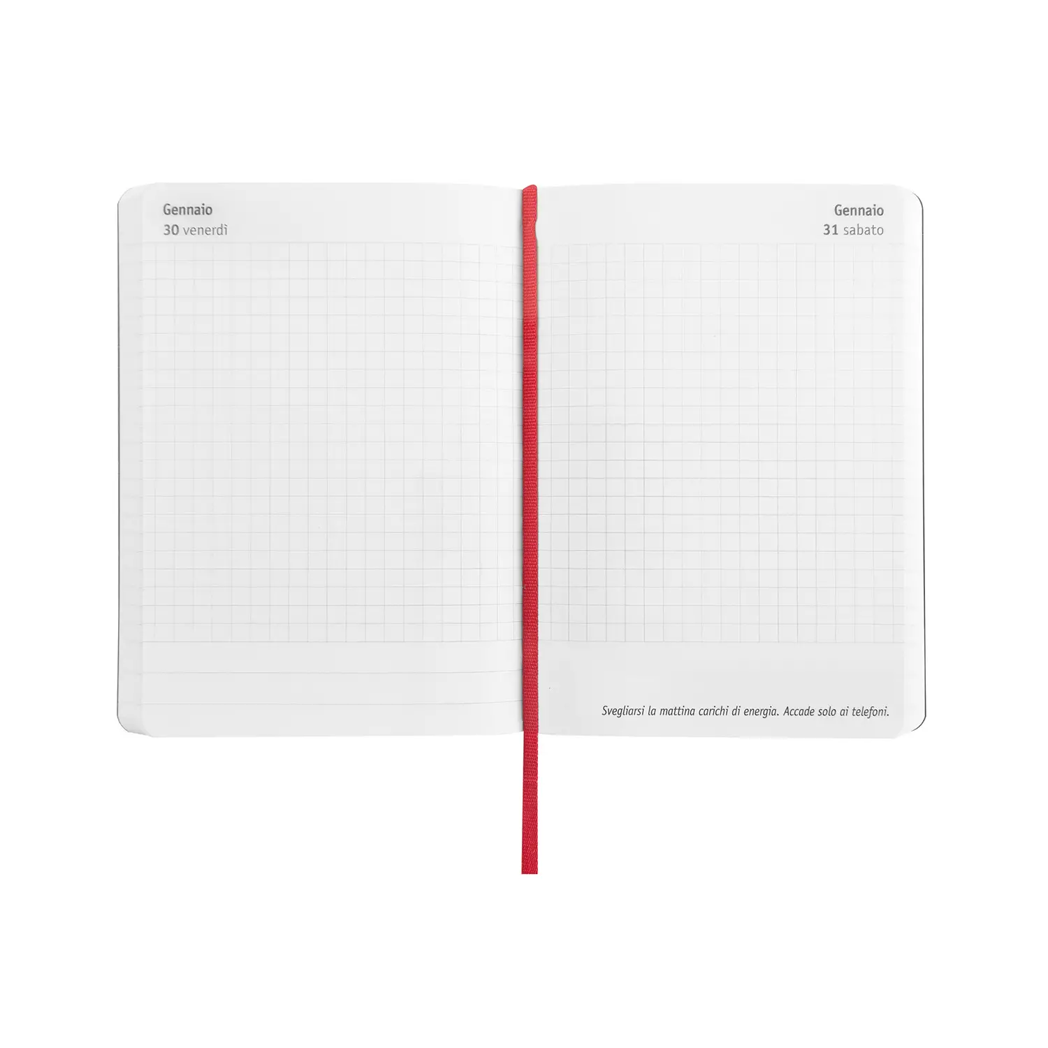 PU cover and elastic closure The planner is covered with a soft red PU cover and raw-cut finish, combined with a sturdy 8 mm elastic band to protect the pages and keep everything in order.