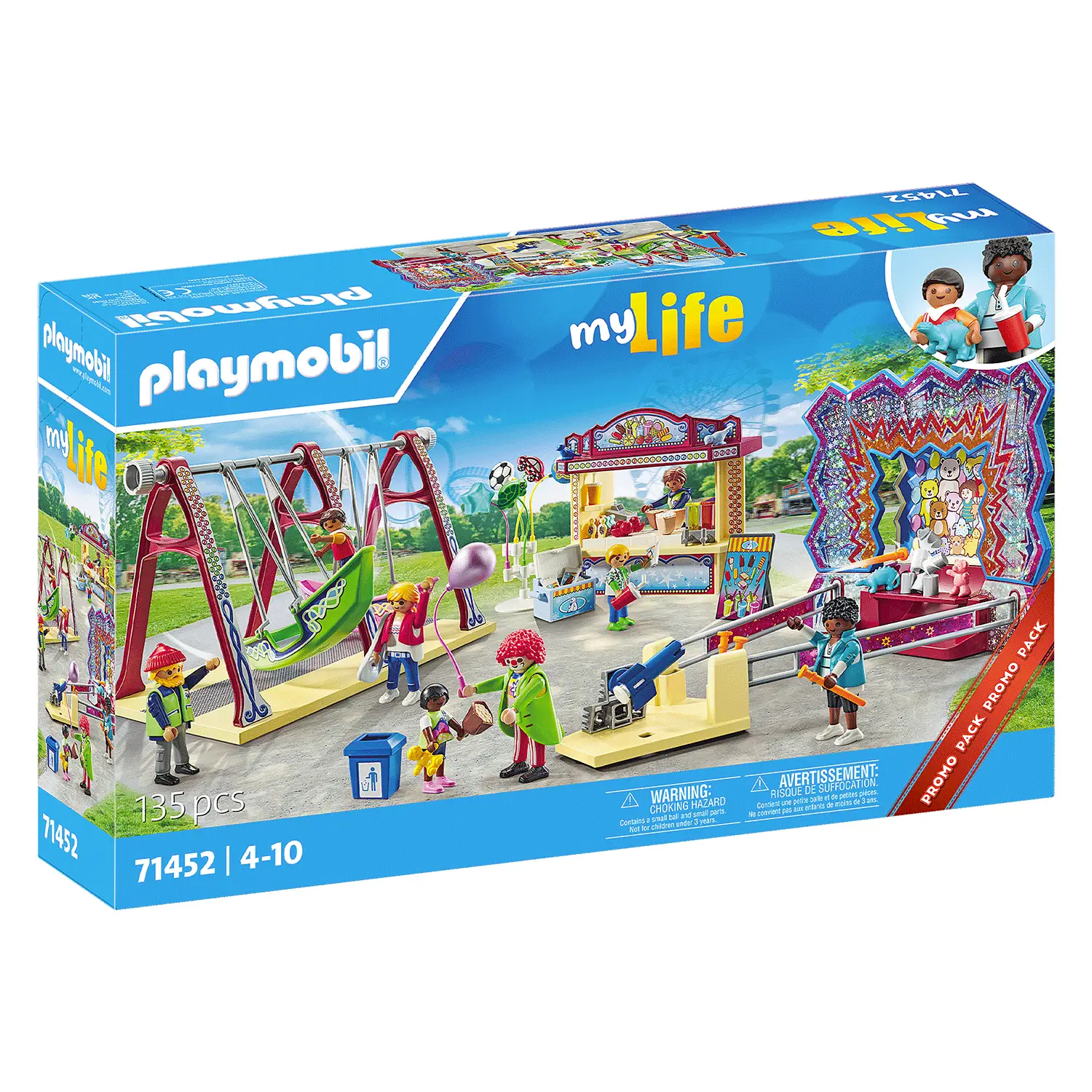 Accessori Inclusi: Il set comprende 8 personaggi PLAYMOBIL, una giostra con barche mobili, un gioco di tiro ai barattoli con meccanismo funzionante, un chiosco rifornito di dolcetti e molti altri accessori per avventure di gioco di ruolo senza fine.