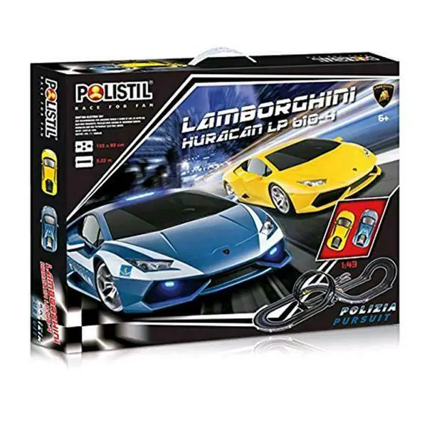 La Pista Lamborghini Huracan Polizia 1:43 è il sogno di ogni appassionato di automobili e di piste elettriche. Il set include due auto modello Lamborghini Huracan LP 610-4 in scala 1:43, un loop singolo e una curva parabolica per un’esperienza di guida senza fine.