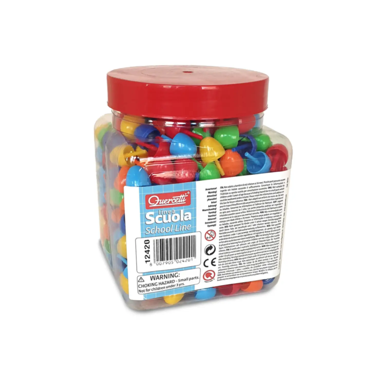 Il set di chiodini Quercetti include 450 grammi di plastica infrangibile in sei colori vivaci. Perfetti per sviluppare la motricità fine nei bambini, garantendo sicurezza e divertimento.