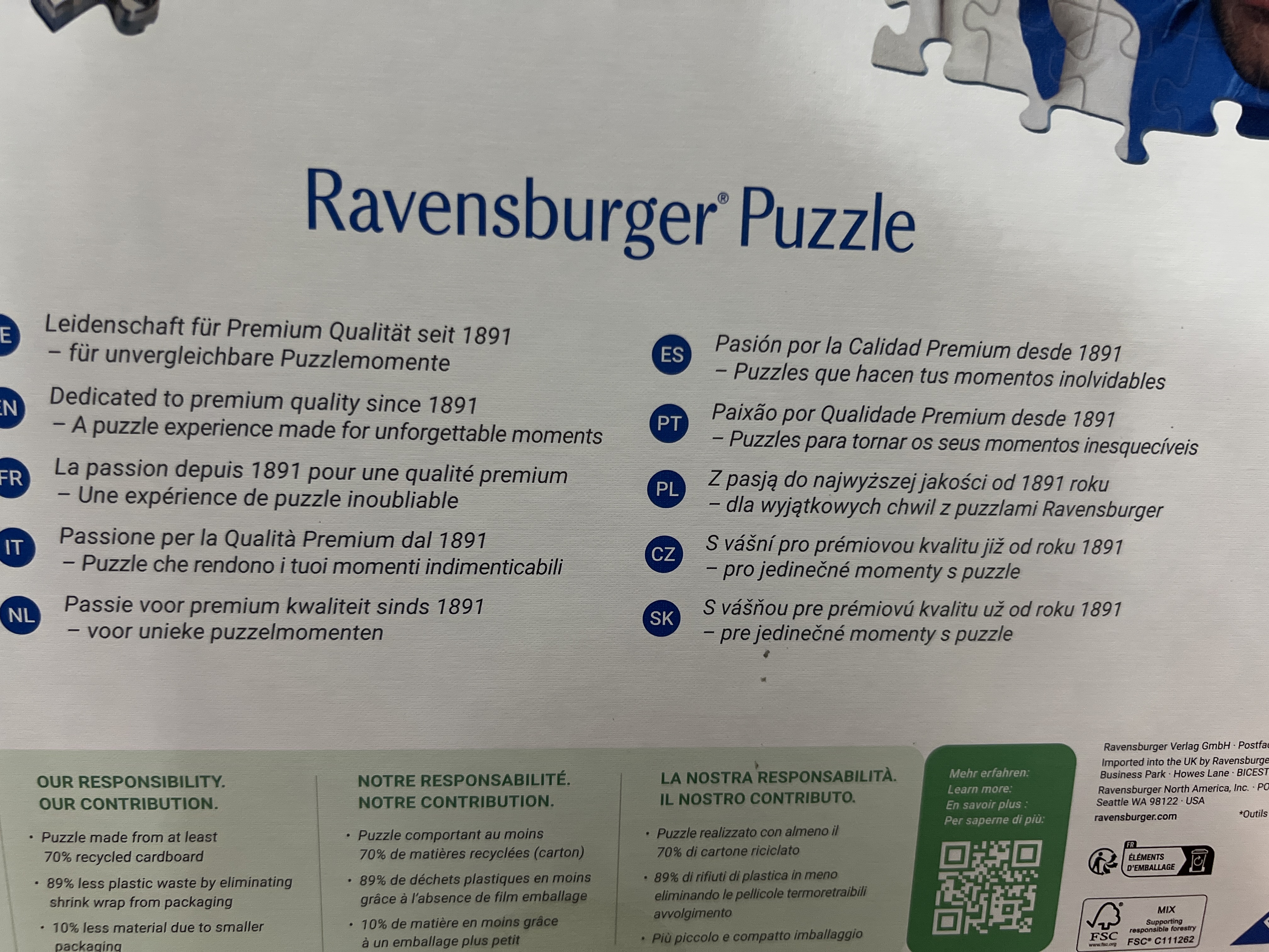 High Quality and Environmentally Friendly Materials Ravensburger uses high-quality recycled cardboard, ensuring sturdiness, bright colors and no reflections. Handcrafted die cuts ensure perfect joints for a flawless result.