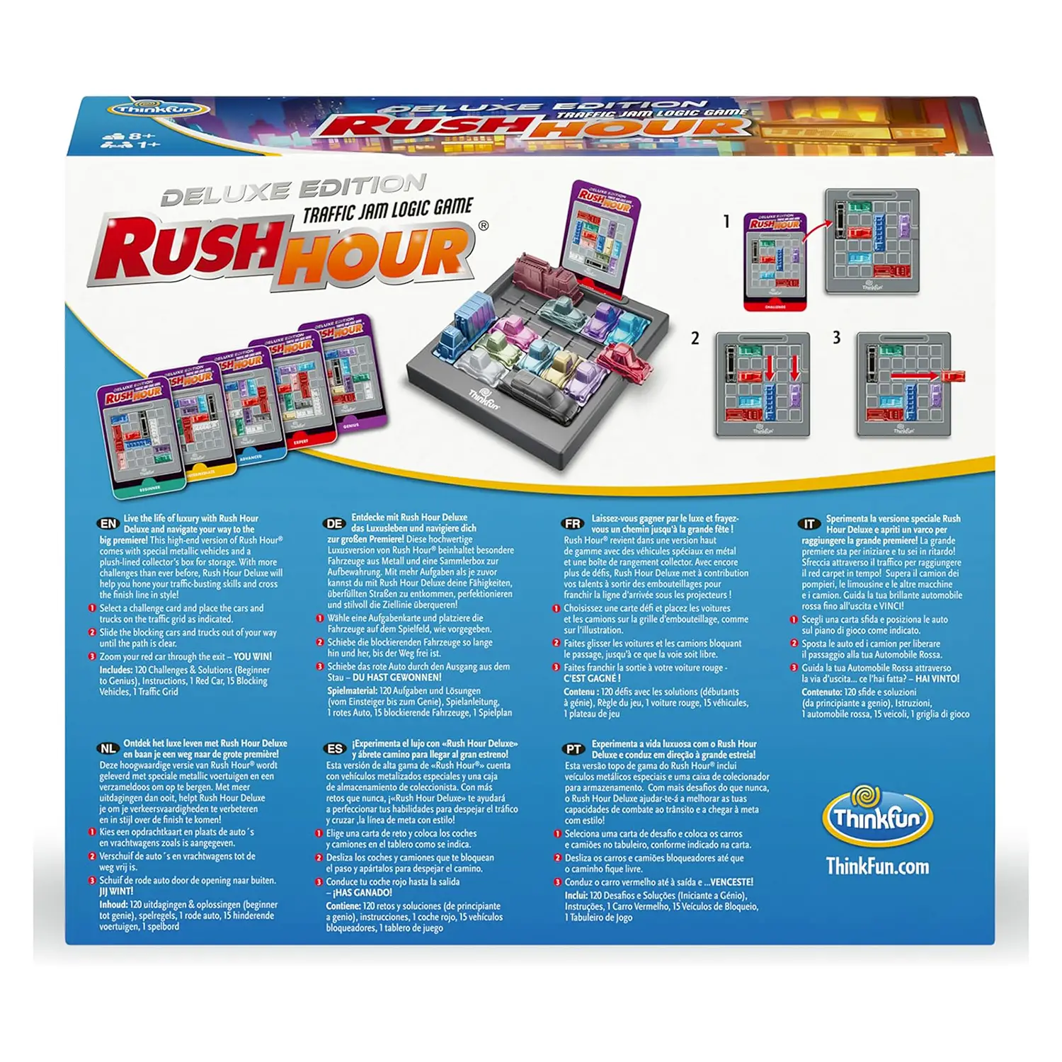 Per bambini e adulti dai 8 anni Grazie alle regole semplici e intuitive, Rush Hour Deluxe è adatto a bambini dagli 8 anni e adulti. Il formato compatto permette di portarlo in viaggio e giocarci ovunque, rendendolo il passatempo perfetto a casa, in auto o in vacanza.