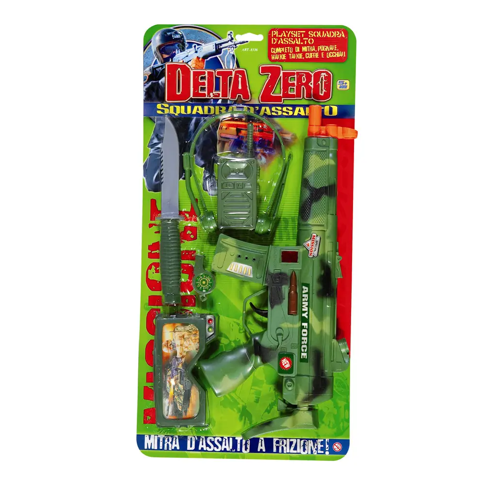 - ✅ Complete military set with machine gun, dagger, walkie talkie, headphones and goggles included.
