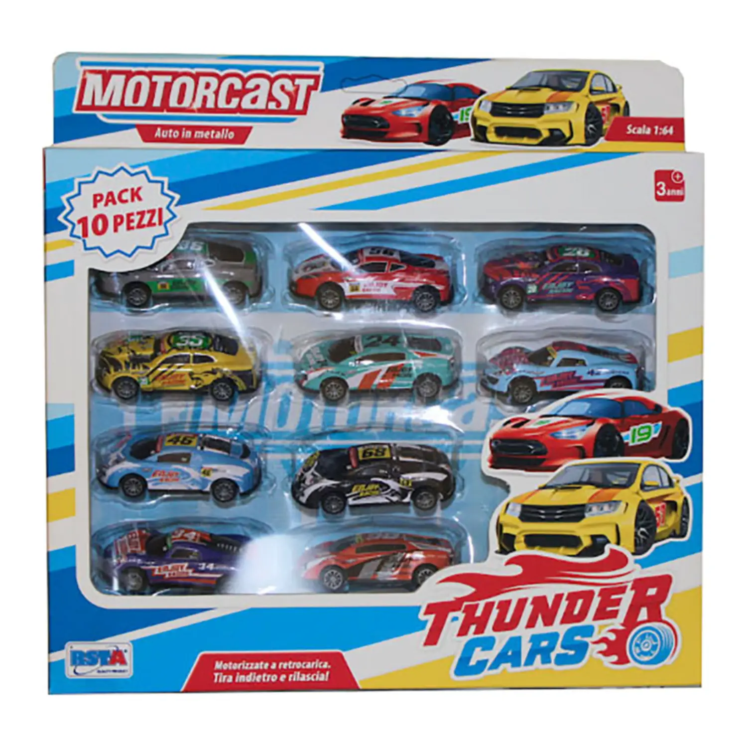 The "RsToys Motorcast - 10 Metal Cars Retrocharge Scale 1:64" is a toy set representing a collection of miniature cars. Here are its main features: