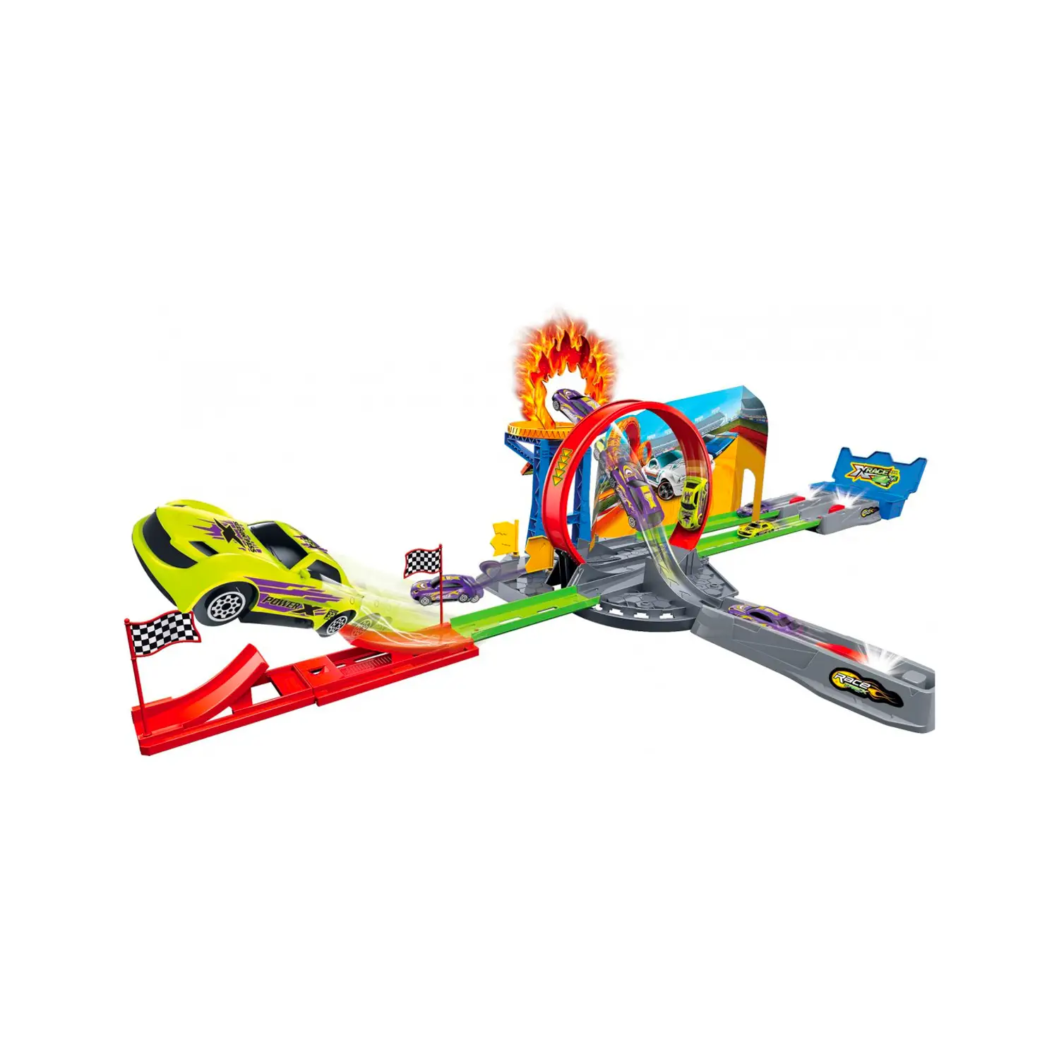 The Aerobatic Challenge is an exciting track designed for speed and stunt enthusiasts. The set includes two race cars and three spectacular tracks for high-adrenaline challenges. With dizzying turns, fast straights and even a loop of death, the cars can perform breathtaking stunts.