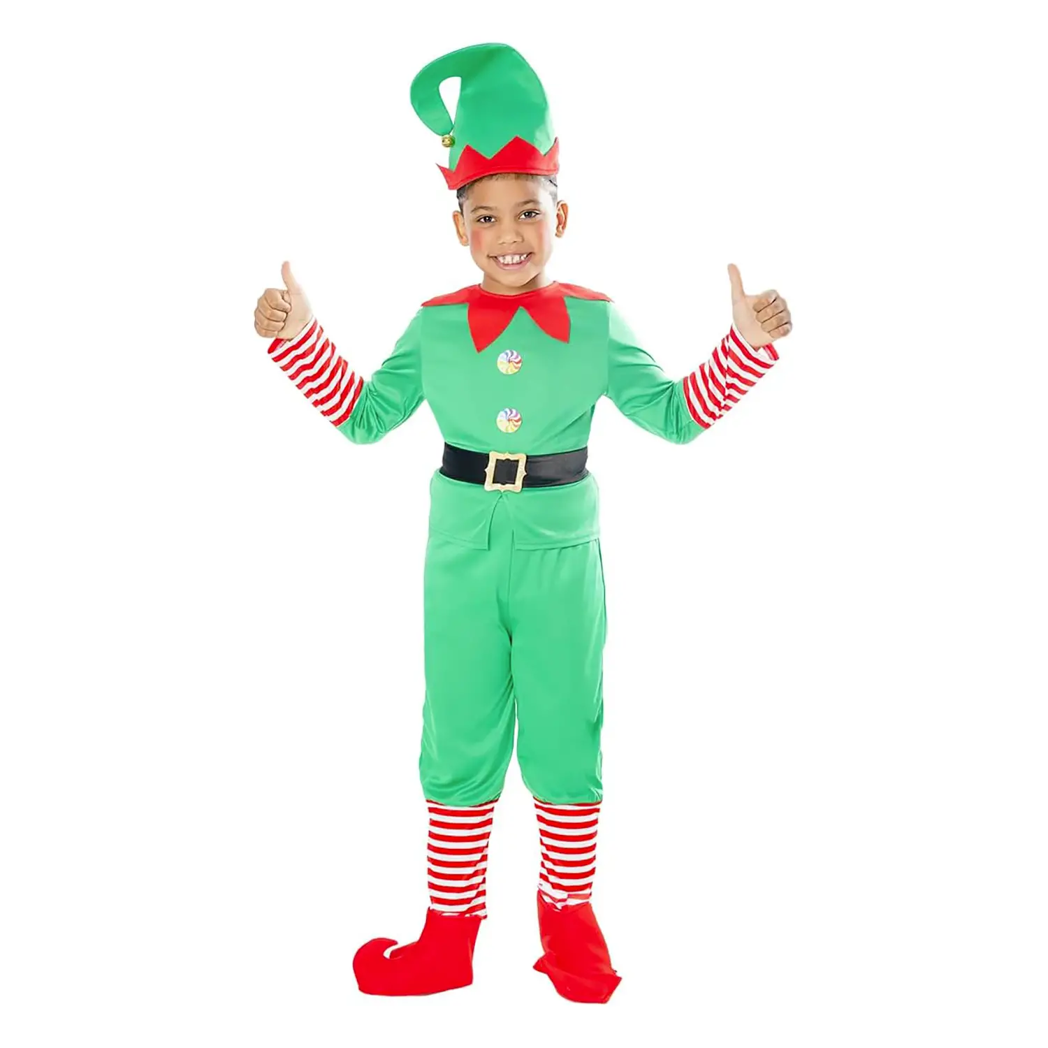Design Allegro e Dettagliato Composto da maglione e pantaloni verdi con stampa da elfo, cintura con fibbia dorata e copristivali rossi, ricrea alla perfezione l’iconico look degli aiutanti di Babbo Natale. Include il classico cappello a punta.
