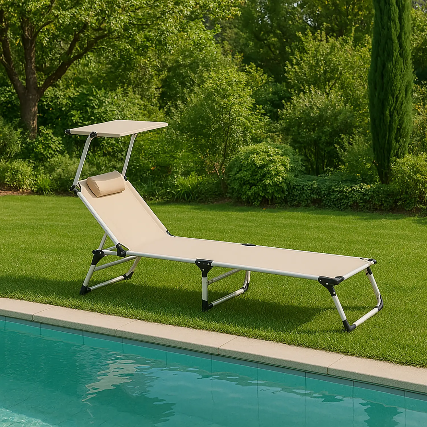Mackay Folding Sunbed with Sunshade, Aluminum Frame and Textilene Canvas Ecru