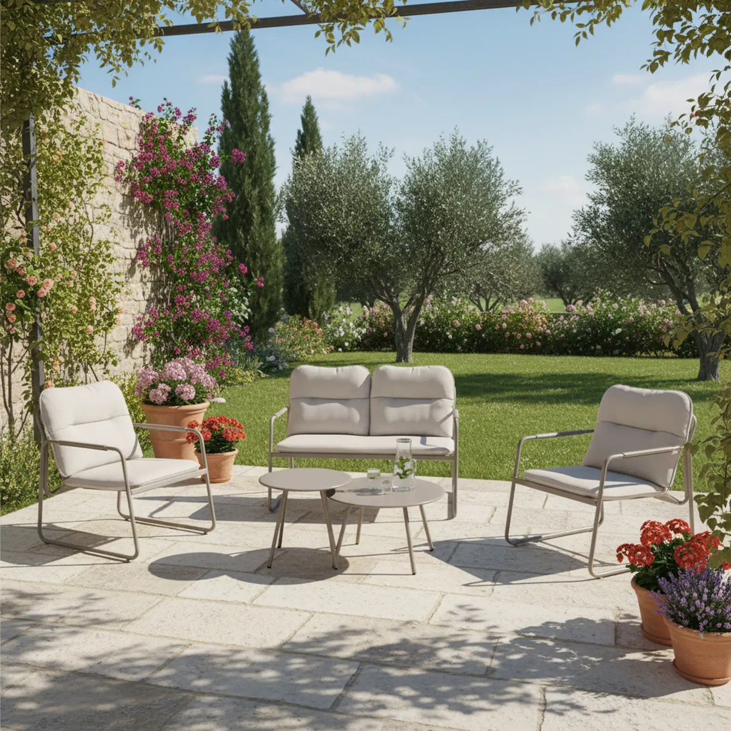 - ✅ Set completo lounge con divano 2 posti, 2 poltrone e tavolini coordinati.