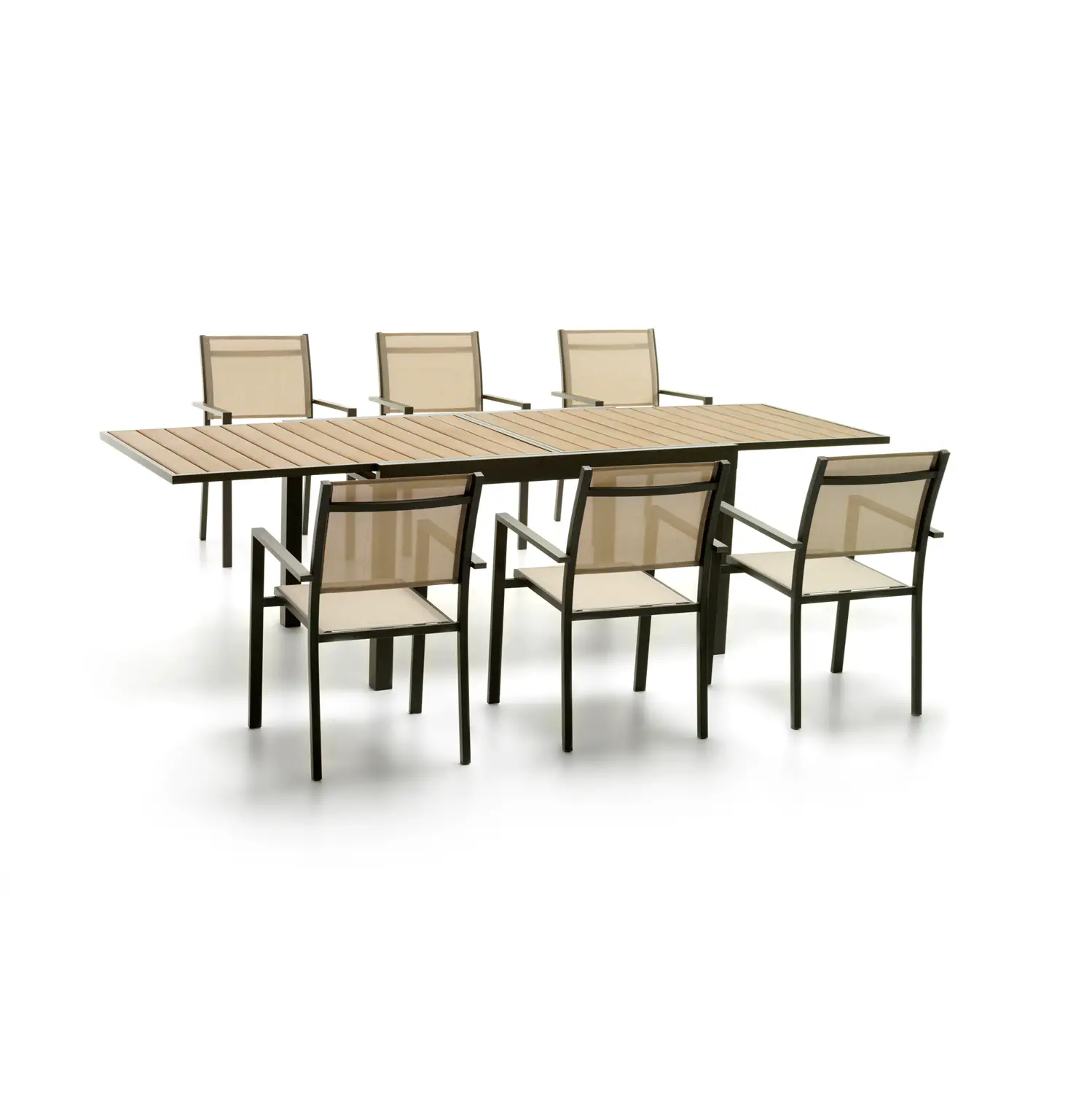 Struttura in alluminio verniciato a polvere epossidica – Colore brown, resistente alla ruggine e agli agenti atmosferici. Piano a doghe in Polywood effetto Teak – Elegante e durevole, con un look naturale. Sistema di allungamento a scorrimento – Facilmente regolabile con una prolunga di 135 cm. Capacità modulabile – Ideale per 6-8 persone, perfetto per cene e pranzi all’aperto.
