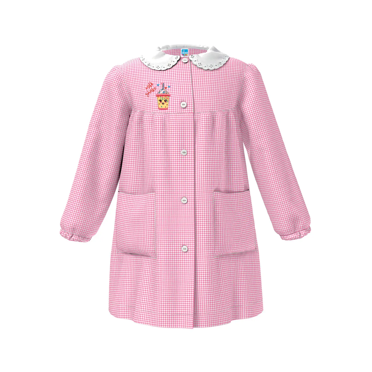 Sweet Style for Kindergarten Days The 4-year-old pink checkered Milk Shake apron is ideal for accompanying every little girl with a cheerful and neat look during all school activities.