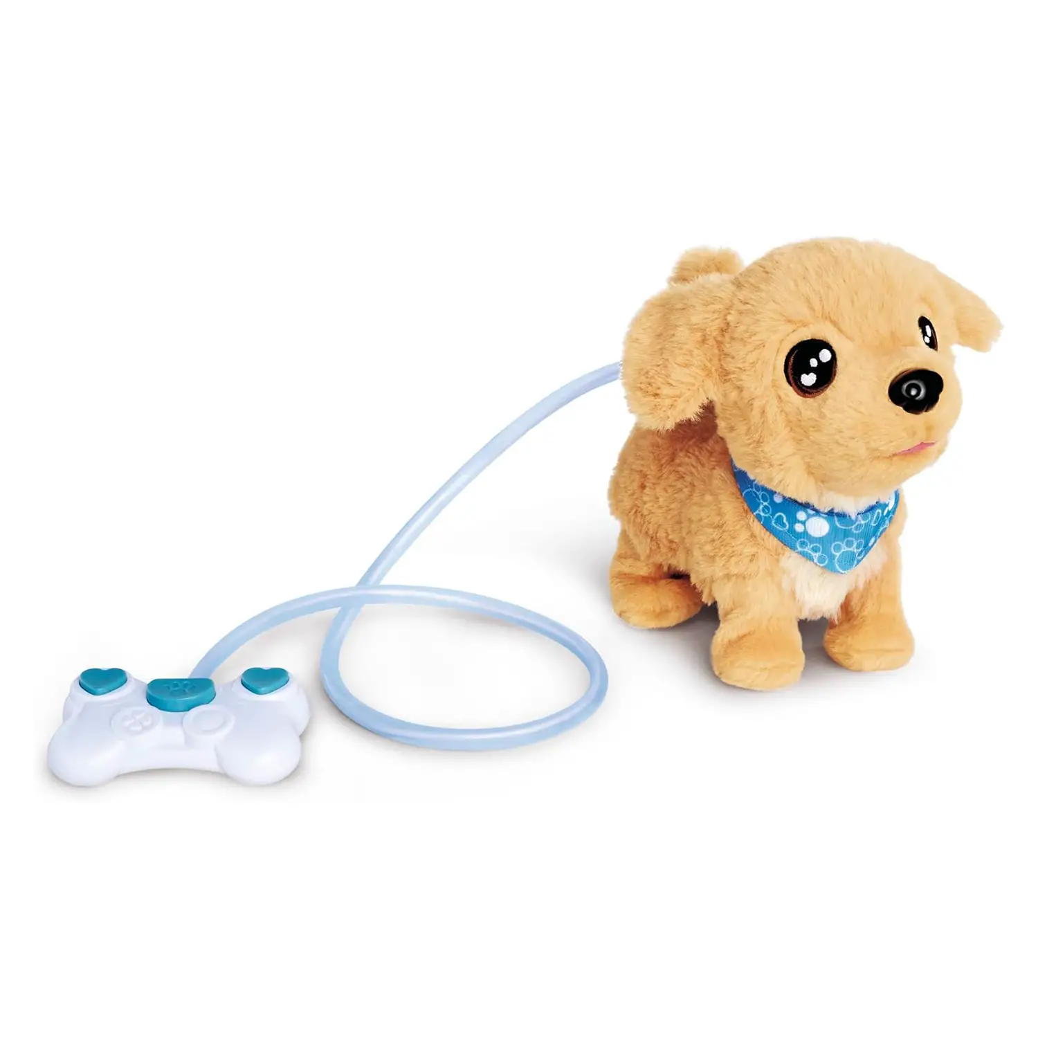 Philoguided and interactive: the little Golden Retriever can walk, bark and wag its tail thanks to the bone-shaped white remote control connected to the dog with a leash.