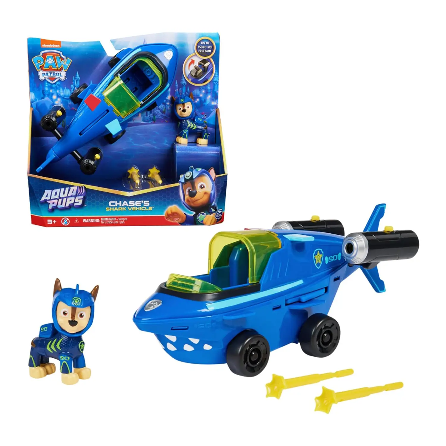 - ✅ Veicolo trasformabile Aqua Pups a forma di squalo, ispirato alla serie PAW Patrol, per emozionanti missioni di salvataggio subacquee.