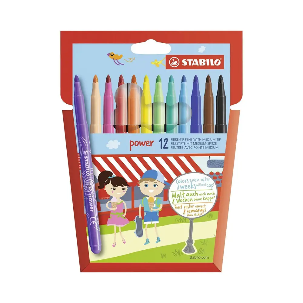 Include 12 pennarelli STABILO Power originali con colori vivaci e brillanti, perfetti per disegni creativi, attività scolastiche e lavoretti artistici.