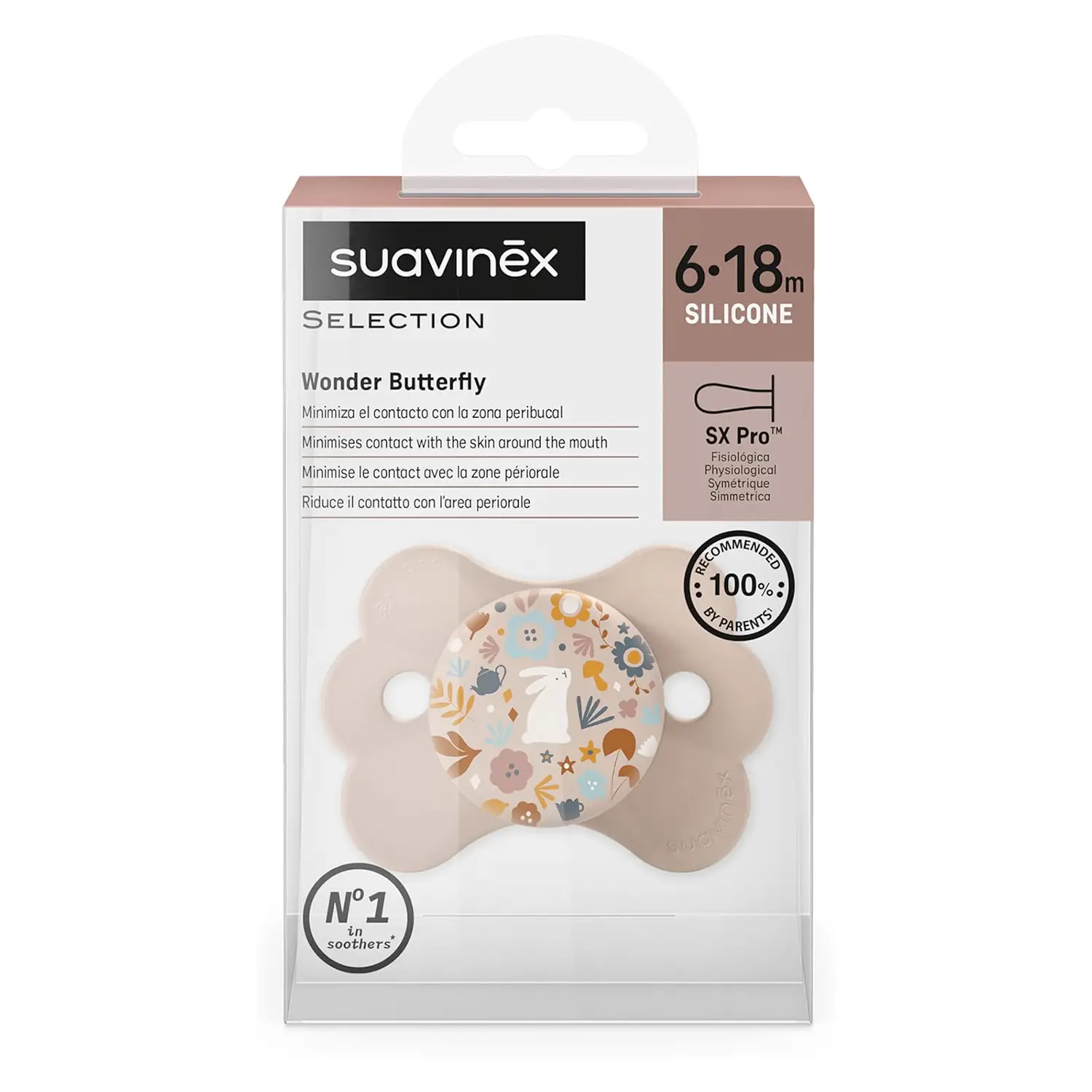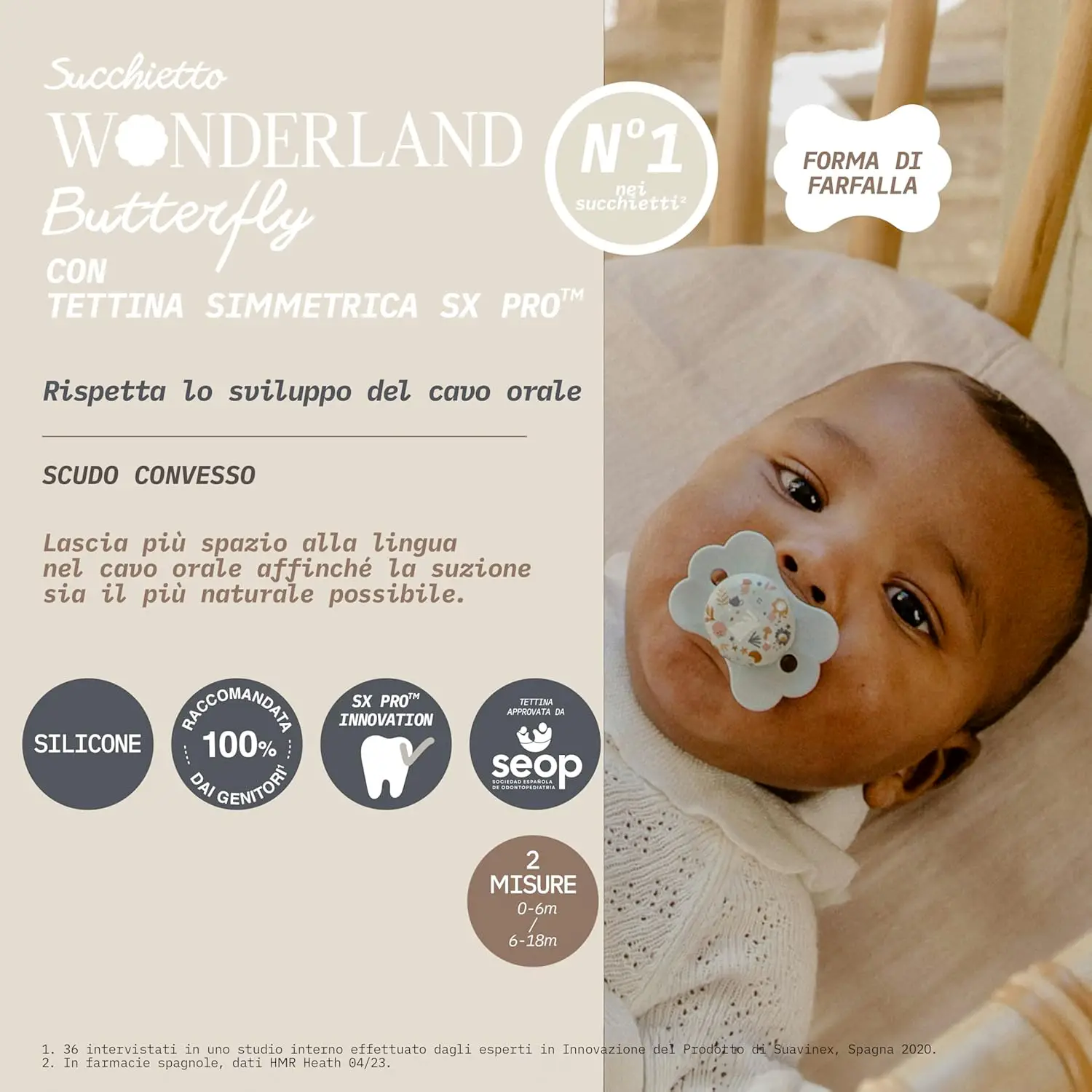 Wonderland pacifier: comfort and ergonomic design The new Wonderland pacifier features a symmetrical SX Pro physiological teat and butterfly-shaped shield. Ideal for infants from 6 to 18 months, it respects the anatomy of the face.
