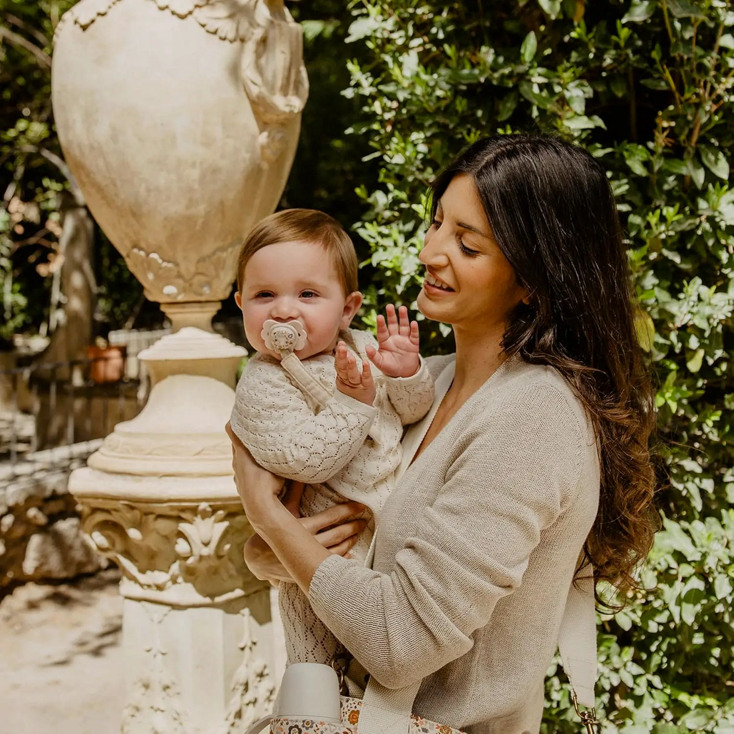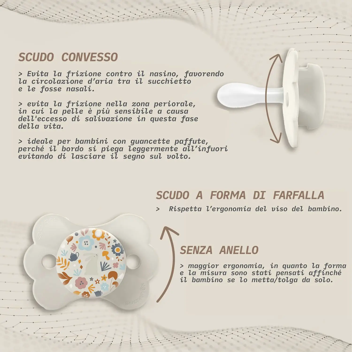 Anti-irritation comfort and self-use The convex shield prevents skin marks and irritation in the perioral area. The absence of the ring promotes the child's autonomy. Compatible with Wonderland fabric chains for safe and convenient use.