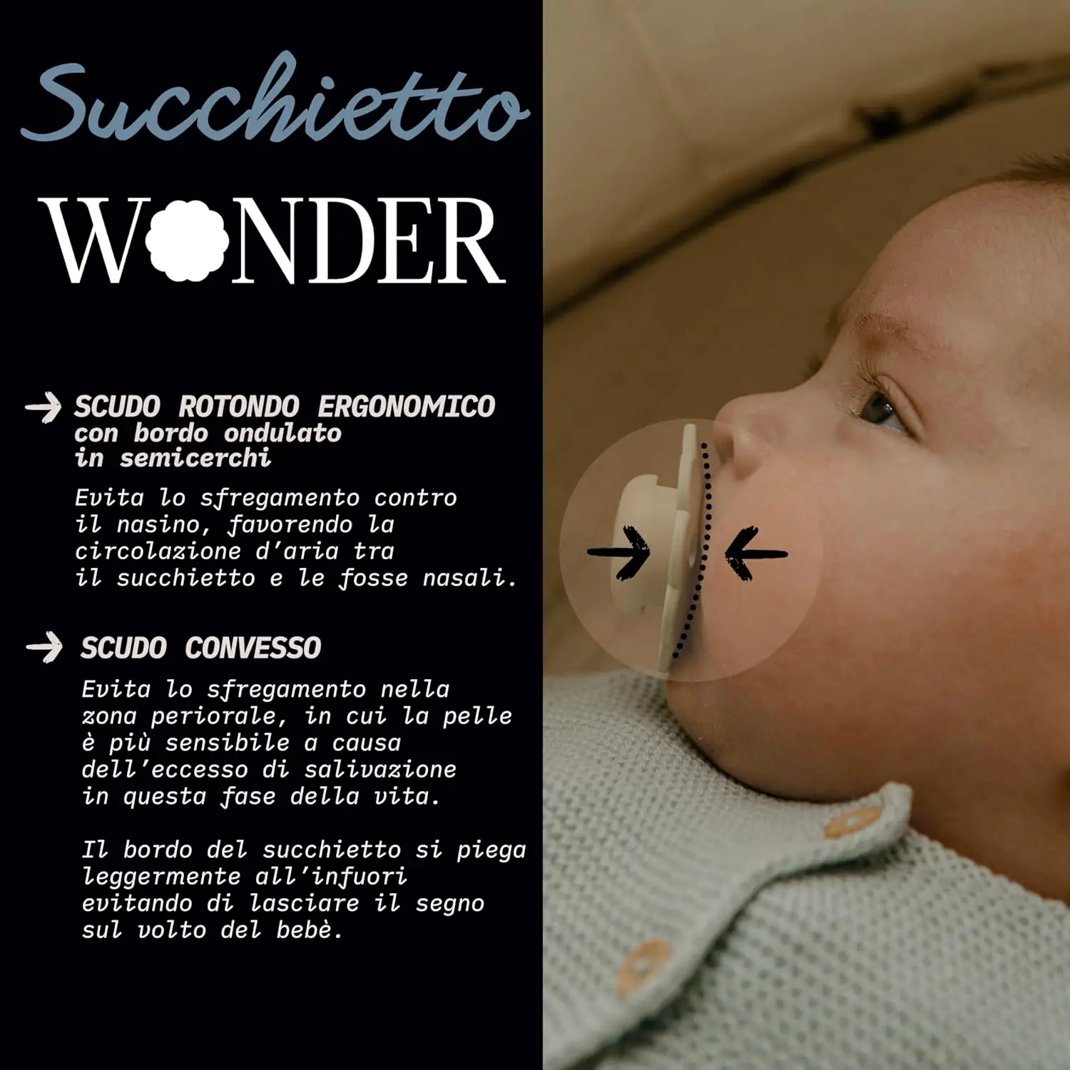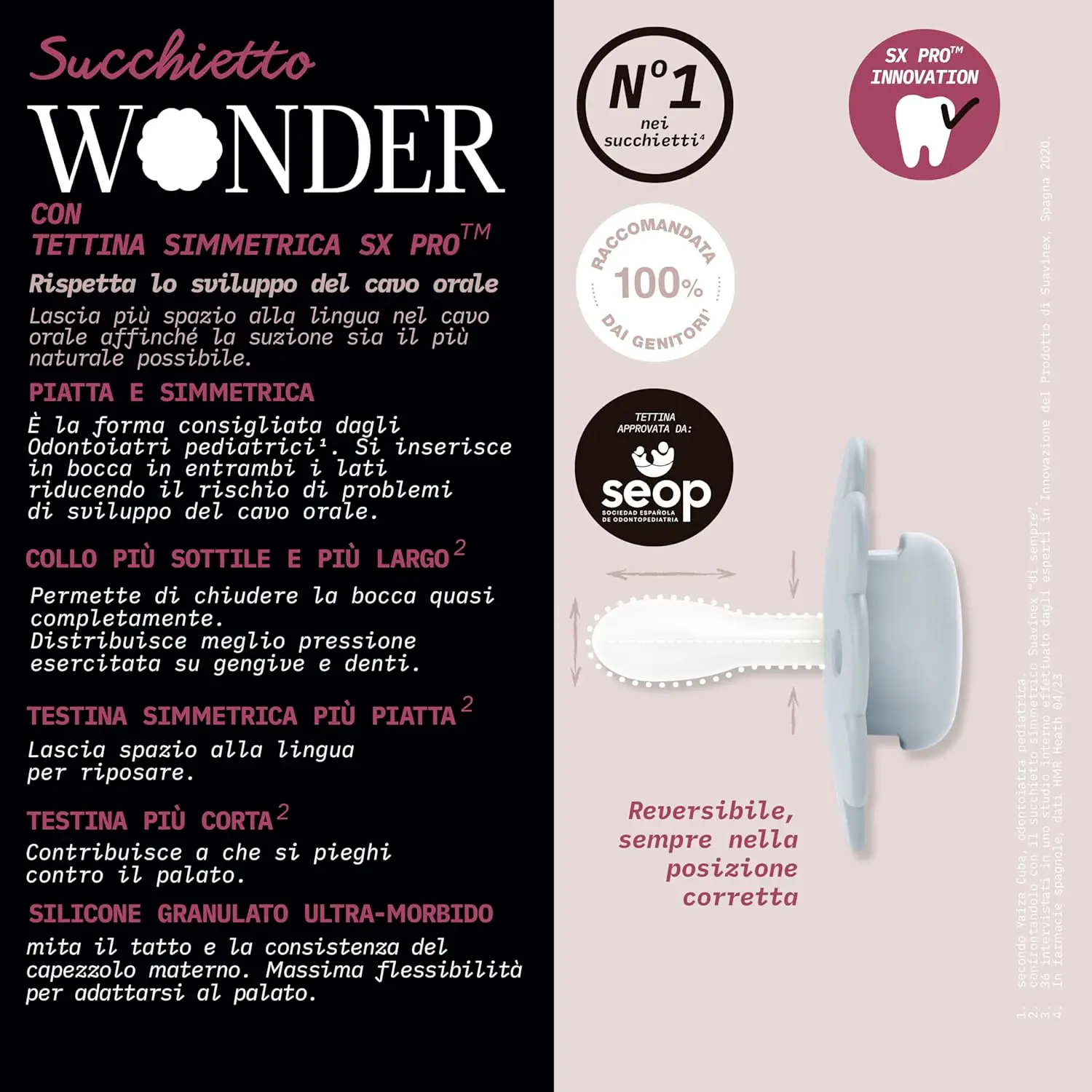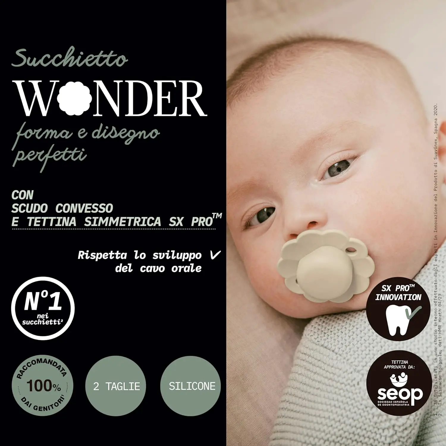 Wonder pacifier: ergonomics and safety for little ones The Wonder pacifier is ideal for infants from 0 to 6 months. Featuring SX Pro symmetrical silicone teat and round shield, it is designed for maximum oral comfort and well-being.
