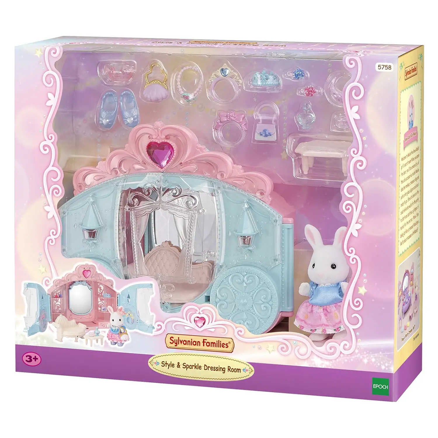 Discover the magical world of the princess dressing room carriage by Sylvanian Families! Open the doors and reveal an array of enchanting accessories: a sofa, coffee table, crowns, bags, hoops, jewelry and shoes. Perfect for children ages 3 and up.