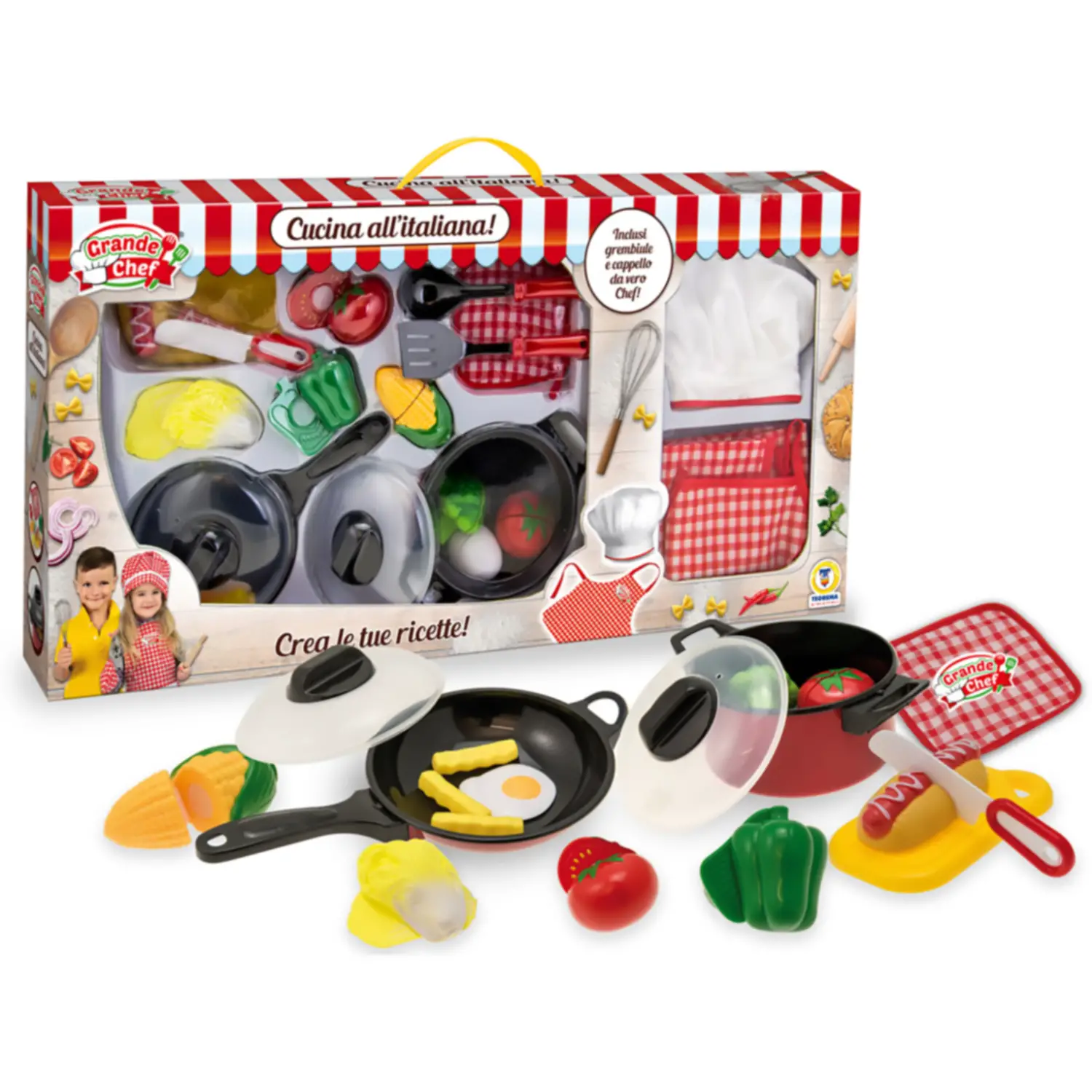 Il Grande Chef - Sfida tra i Fornelli è un set di giochi d’imitazione che permette ai bambini di diventare dei veri chef in cucina. Il set include un cappello e un grembiule da chef, che danno ai piccoli chef un look autentico e professionale.