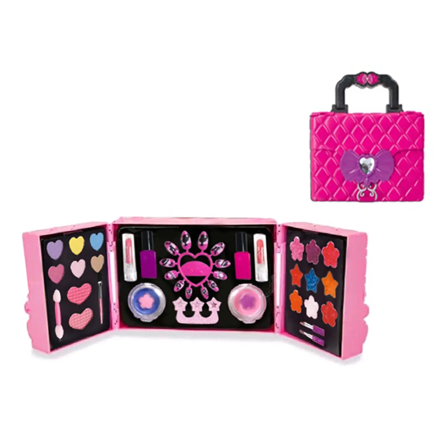 Porta il divertimento del trucco ovunque con la borsetta makeup di Miss Carina! Questa elegante borsetta richiudibile a 3 livelli è perfetta per le piccole appassionate di moda. Include una varietà di ombretti e gloss colorati per creare look diversi e giocare a fare la grande.