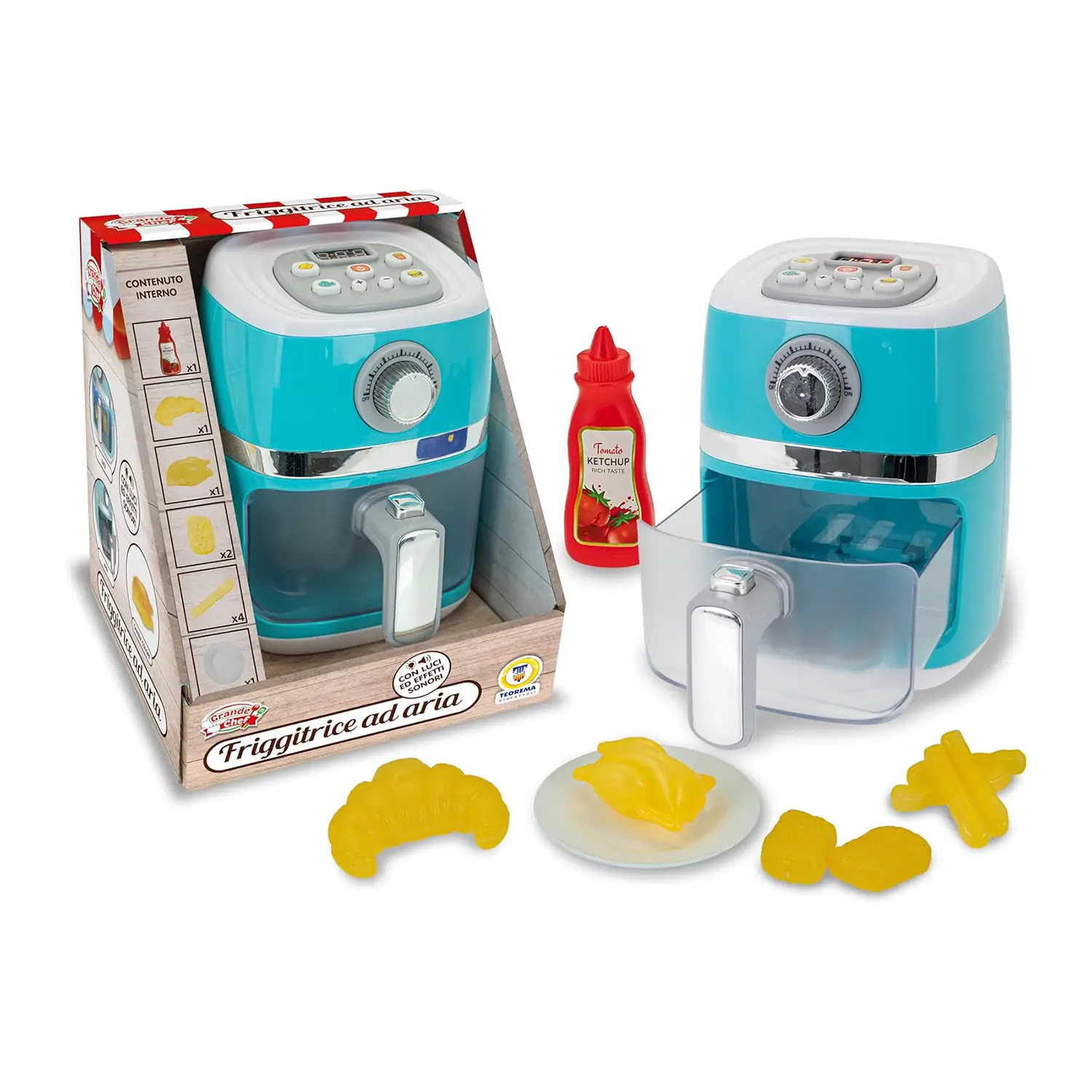 Magia della Cottura con Riggitrice Ad Aria La Riggitrice Ad Aria Funz. Reali Effetto Cottura offre un’esperienza magica: i cibi giocattolo cambiano colore, simulando una vera cottura per stupire i bambini. Luci e Suoni Realistici per Piccoli Chef Con luci, suoni e display digitale, questa friggitrice ad aria di TEOREMA rende il gioco realistico, permettendo ai bambini di sentirsi veri chef in cucina. Set Completo per Divertimento Garantito Include croissant, patatine, pollo, piattino e ketchup. Un kit completo per piccoli cuochi, stimolando creatività e divertimento. Design Sicuro e Educativo Realizzato in plastica atossica, il design sicuro della riggitrice ad aria sviluppa fantasia e coordinazione nei bambini, garantendo ore di gioco educativo.