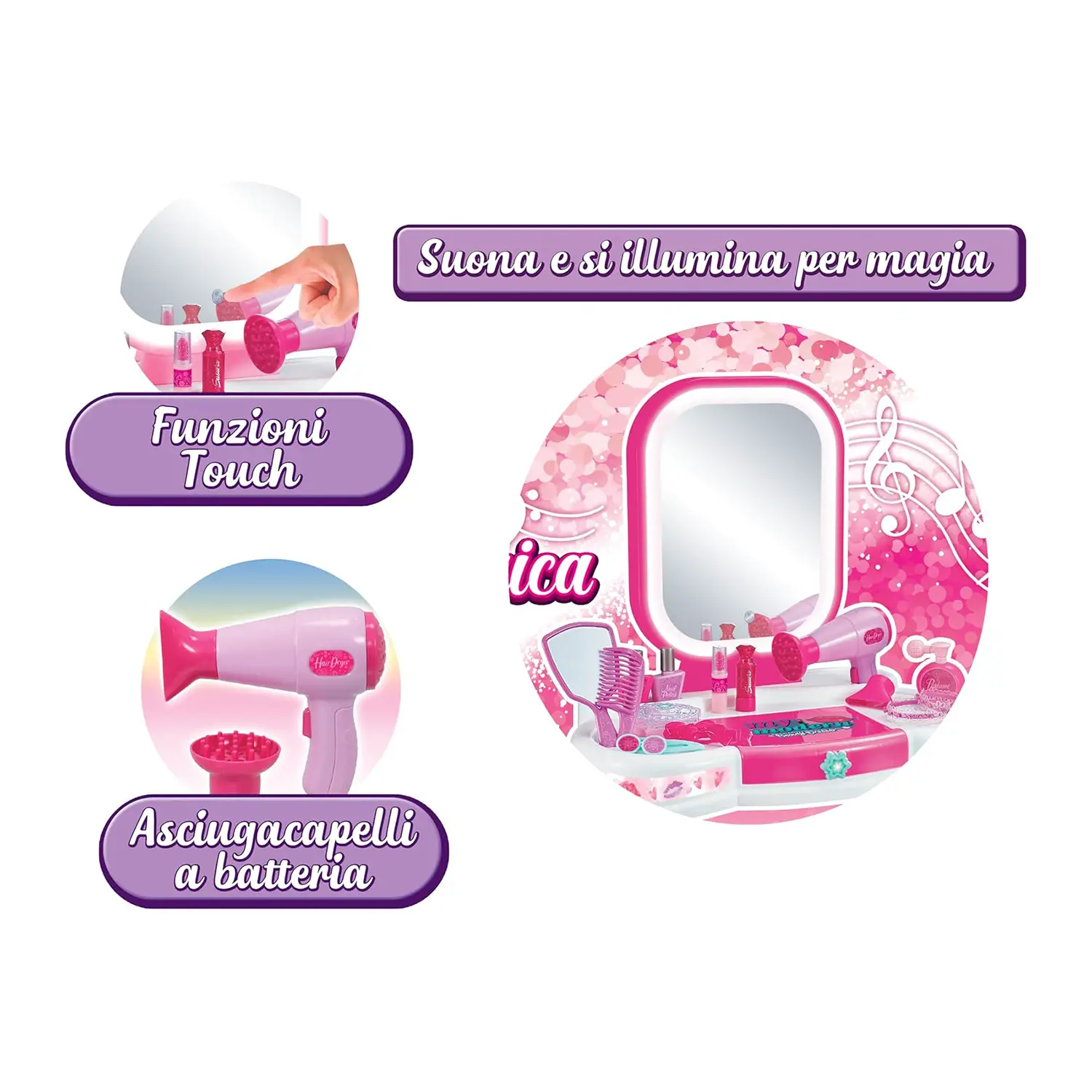 Magia Interattiva Touch La Specchiera Magica Bambina con Sgabello e Luci LED di TEOREMA offre magia interattiva. Un semplice tocco illumina lo specchio e riproduce melodie, creando un’esperienza di gioco coinvolgente.