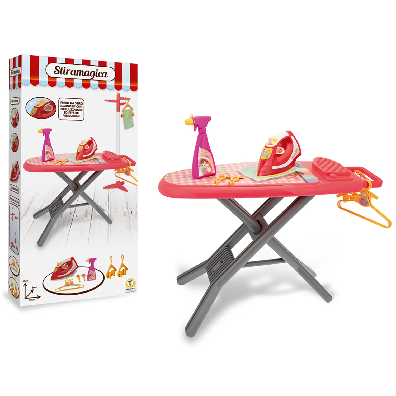 Dimensioni e Accessori Con dimensioni di 70 x 50 x 24 cm, il set include un asse da stiro stabile, una ferro da stiro luminoso con effetti sonori, uno spruzzino, e appendiabiti colorati, creando un ambiente di gioco realistico.